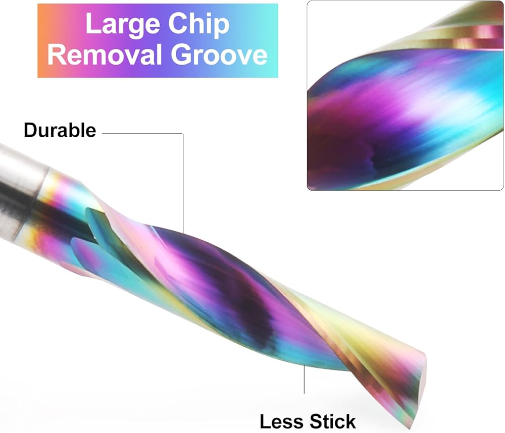 ❇️High Processing Efficiency--Special Single flute CNC Router Bits with large chip removal groove effectively reduces cutting resistance, convenient for chip removal, end with clean edge on both top and bottom face, non-stick with the spiral end mills, making the workpiece smoother and brighter, largely improving machining efficiency