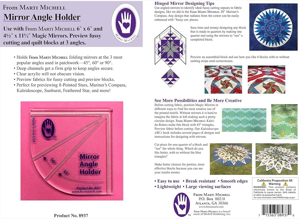 MARTI MICHELL-Folding Magic Mirror lets you be more creative! Preview all kinds of quilt blocks before cutting or sewing. This lightweight mirror is break resistant and has smooth edges, a larger viewing surface and is easy-to-use. It even comes with helpful instructions. Great for positioning fabric when making 8-pointed stars or other multi-sided designs. Magic Mirror measure is 6x6 inches. Made in USA. WARNING: This product can contains chemicals including Poly(methyl methacrylate), which is known to the State of California to cause cancer. For more information go to www.P65Warnings.ca.gov.