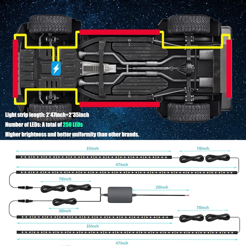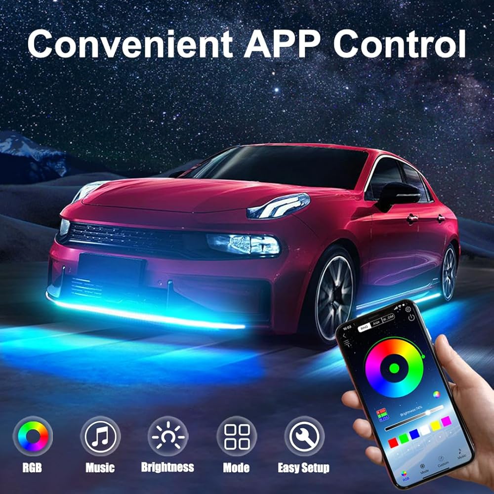 App Control & 16 Million Colors: Our Underglow Lights use wireless APP for control suitable for IOS or Andriod. Choose any color you like from 16 million colors. APP control to turn lights on or off, dim or brighten and even adjust the speed of mode.