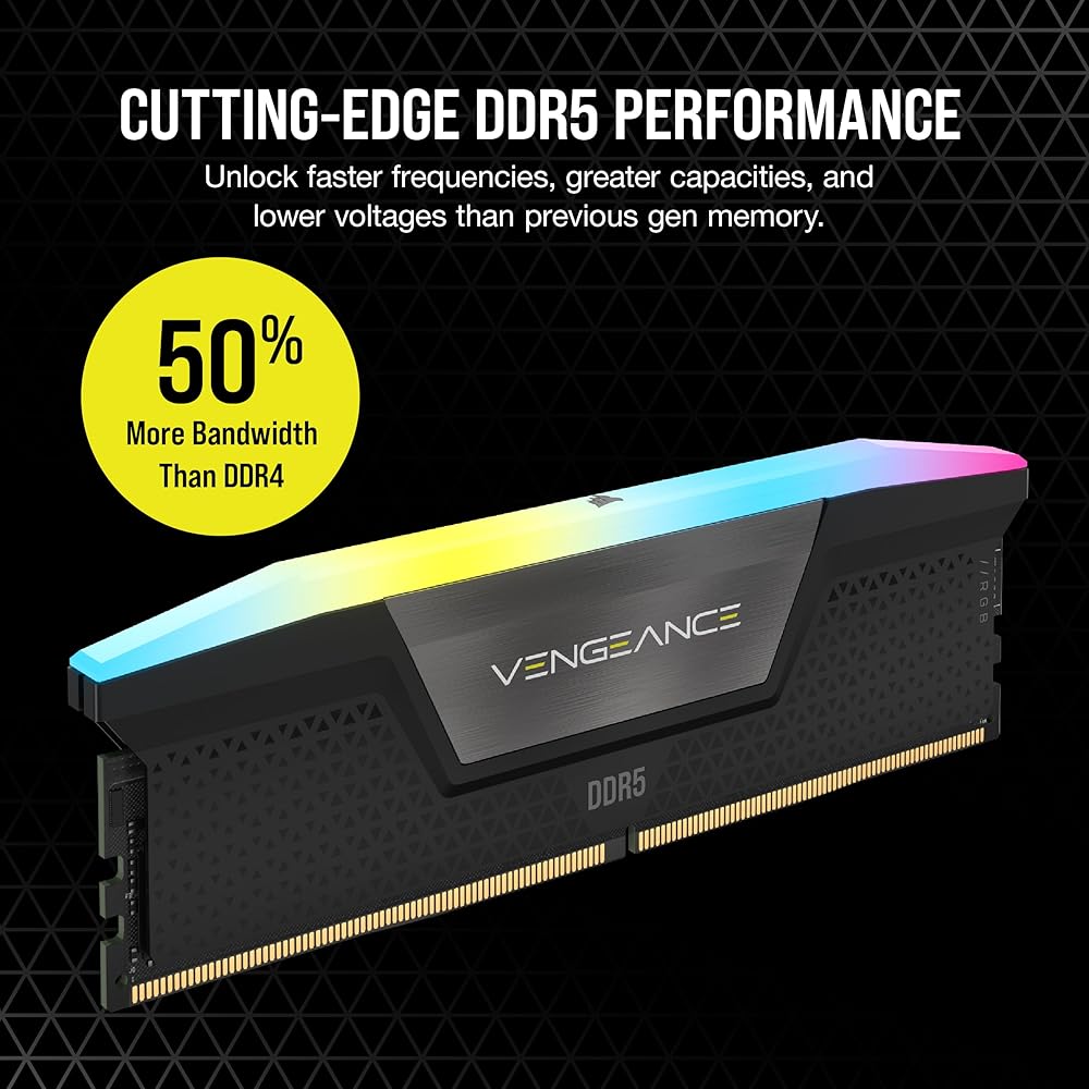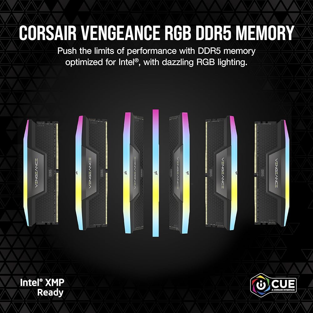 CORSAIR VENGEANCE RGB DDR5 memory delivers DDR5 performance, higher frequencies, and greater capacities optimized for Intel® motherboards while lighting up your PC with dynamic, individually addressable ten-zone RGB lighting. Tightly screened high-frequency memory chips enable faster processing, rendering, and buffering than ever, with onboard voltage regulation for easy, finely controlled overclocking. Take control with CORSAIR iCUE software and enable RGB lighting customization, real-time frequency monitoring, onboard voltage regulation, and Intel XMP 3.0 profile customization. A custom PCB provides superb signal quality for high performance and stability on the latest Intel DDR5 motherboards. For cutting-edge DDR5 performance with mesmerizing RGB lighting, VENGEANCE RGB DDR5 lights the way.