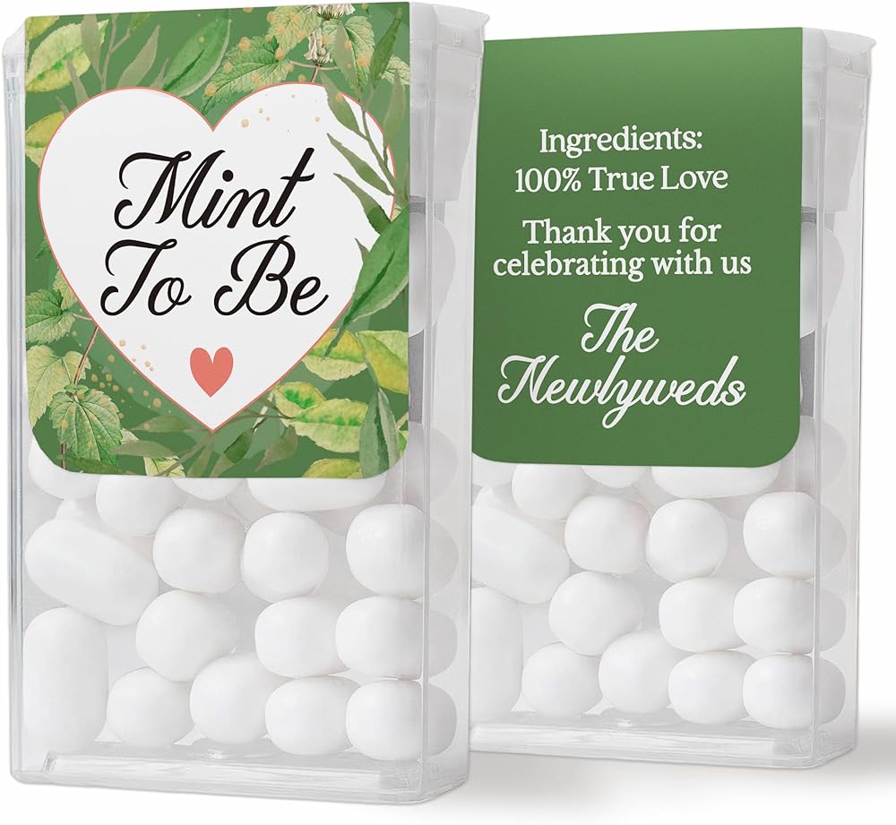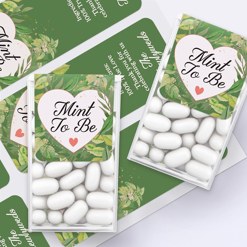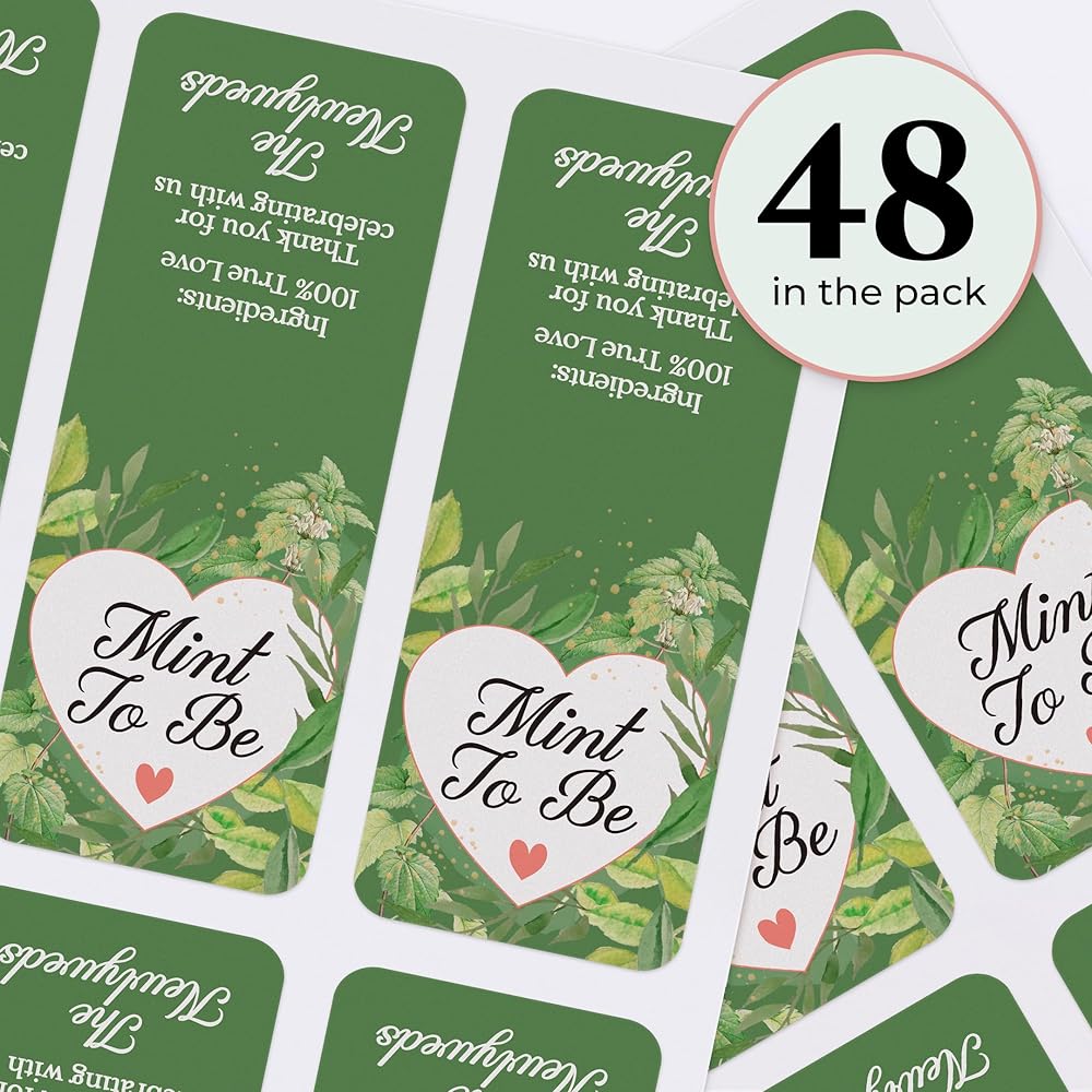 Quantity: 48 Pack of Grenenery mint Wedding favor Labels for Tic Tacs mints that reads Mint to be on the front and Ingredients: 100% True Love, Thank you for celebrating with us, the newlyweds on the backside of the stickers
