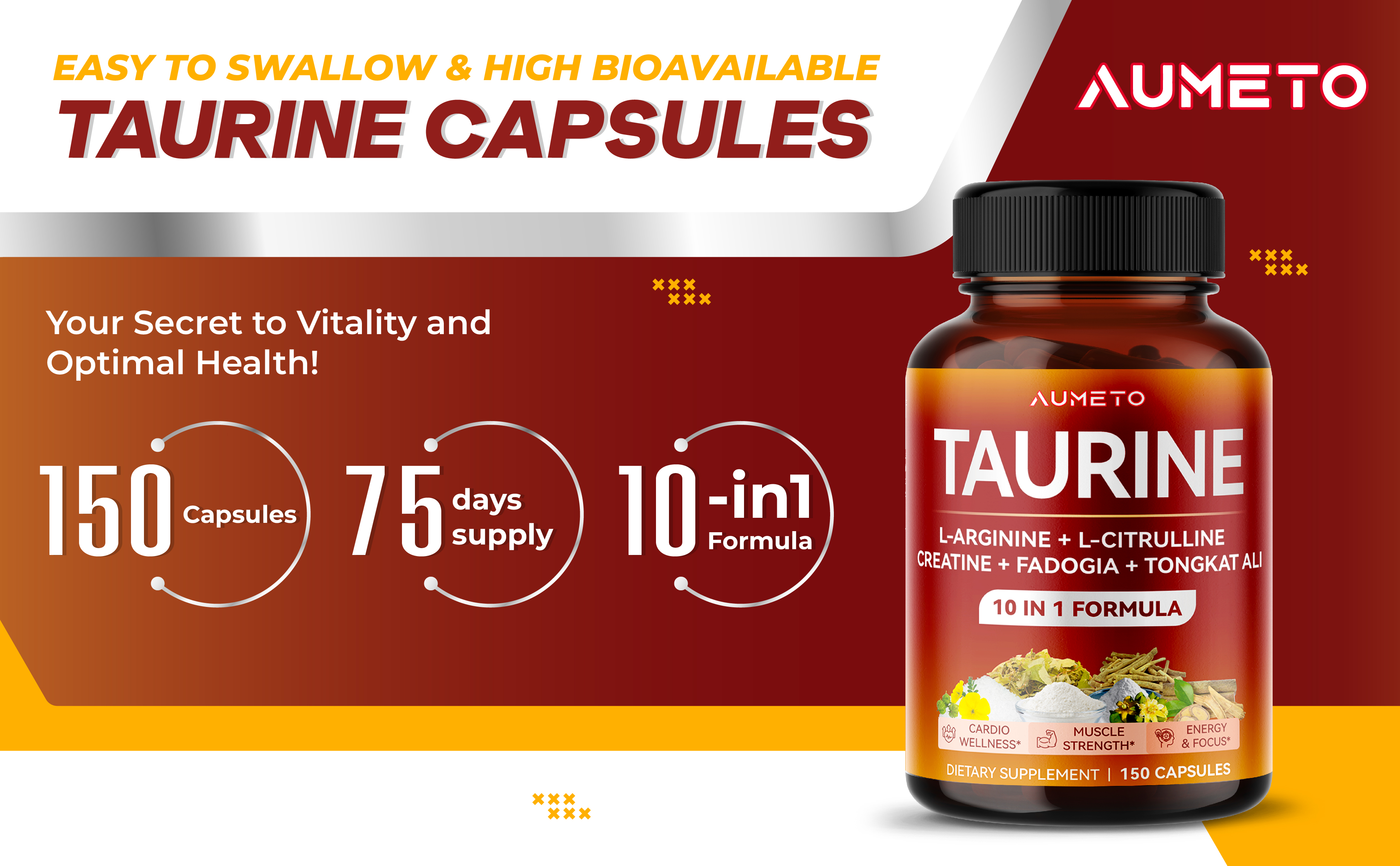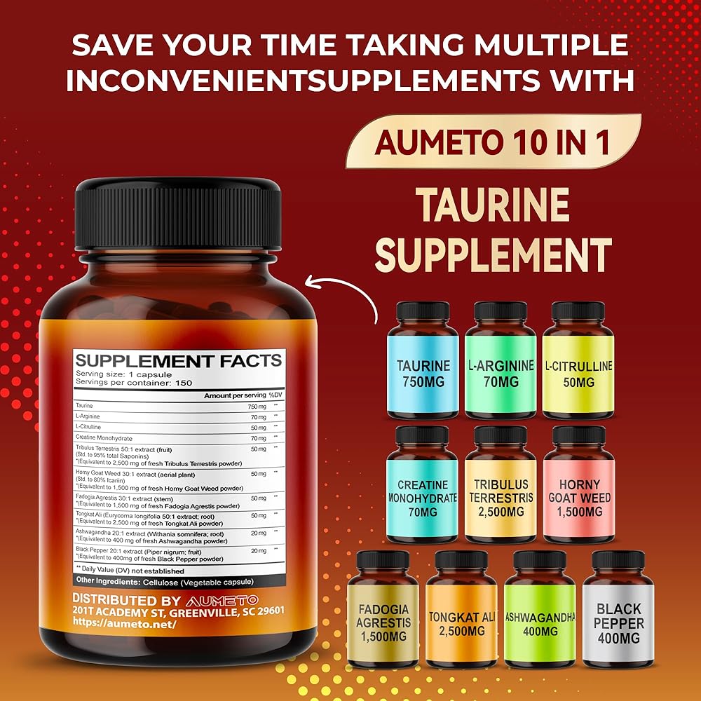 Maximizing Your Gains: Aumeto Taurine enhances cardio wellness, boosts muscle strength, increases energy levels, and sharpens focus, adopting a comprehensive approach to your overall wellness. 100% Natural: Aumeto's ingredients are carefully selected and thoroughly researched before being introduced to the market, sourced from reliable locations such as the USA, UK, and India. They are made from completely natural, non-GMO, gluten-free, vegetarian-friendly ingredients, and are environmentally friendly. Outstanding 10-in-1 Blend: Carefully chosen and rigorously tested ingredients—Taurine, L-Arginine, L-Citrulline, Tribulus Terrestris, Creatine Monohydrate, Horny Goat Weed, Fadogia Agrestis, Tongkat Ali, Ashwagandha, and Black Pepper—provide holistic well-being support. You deserve the best: Aumeto Supplements offers safe and high-quality products at reasonable prices. If you aren't satisfied, we will refund 100% of your money.