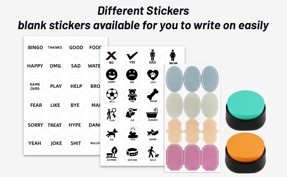 Dog Speak Button with Good Compatibility: These recording button stickers are compatible with most dog training buttons. It could enrich the dogs' 'talking' words effectively. The dog communication button stickers provide a clear and organized approach to communicating with your dogs or cats!