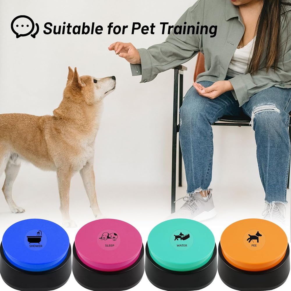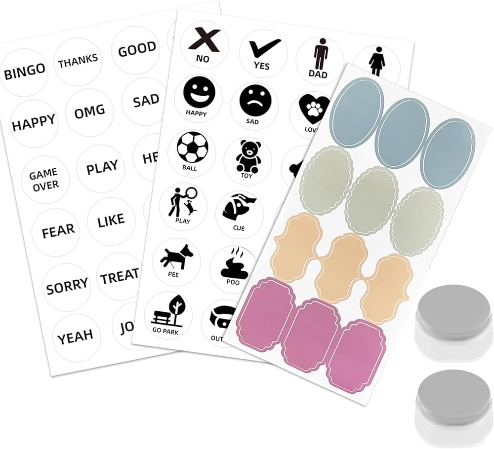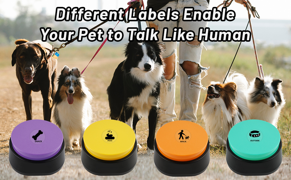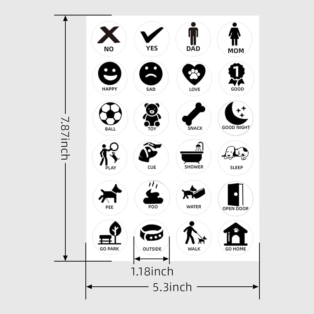 Various Dog Talking Button Stickers: With 24 different patterns and 24 types of text, these stickers cover a wide range of pet movements, allowing you to communicate various commands during pet training. You could also write or draw yourself, and then playback with your pets!