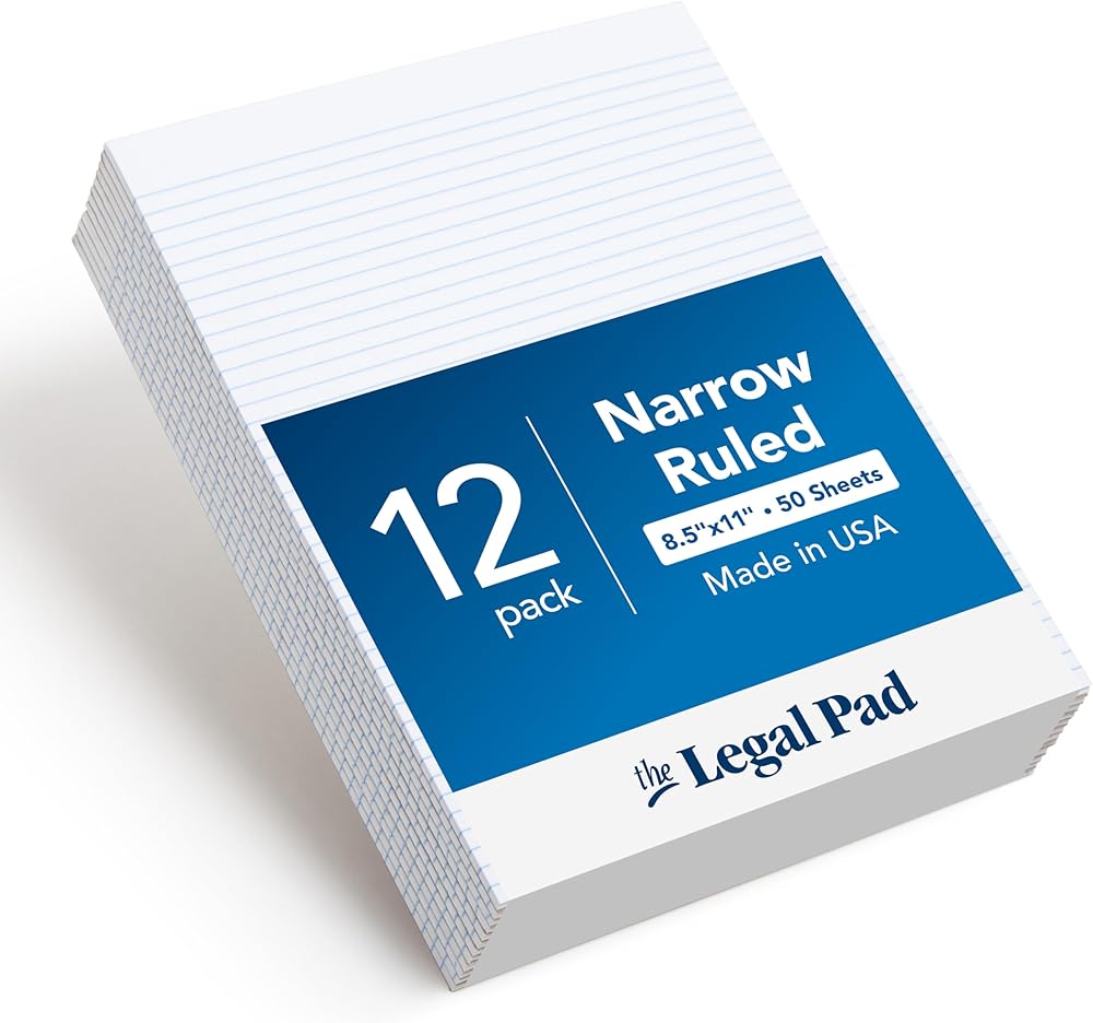 TOPS The Legal Pad Writing Pads offer the ultimate value in reliable glue-top legal pads for home or office. The classic format long preferred by attorneys and professionals gives you quick access to notes and lists. Glue-top sheets detach cleanly to keep your notes neat and tidy. Proudly made in the USA. 8-1/2" x 11". Narrow ruled, 50 sheets. 12 Pack.