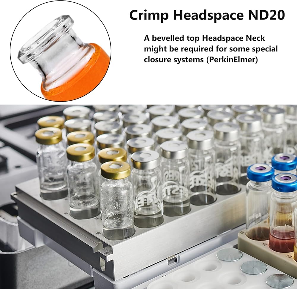 Beveled Finish Vial : Reduced the amount of sealing surface between the crimp seal and the glass surface,Also A bevelled top Headspace Neck might be required for some special closure systems (PerkinElmer)