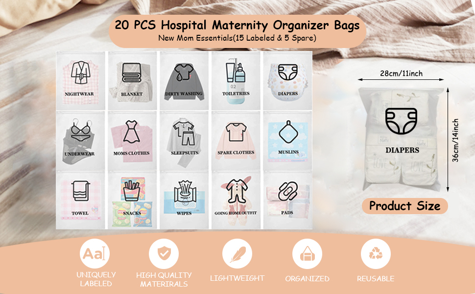 Sufficient Supplies: this package comes with 15 labeled maternity bags and 5 Spare unlabled bags,ample quantity and variety of styles to satisfy your demands of packing clothes, pants, underwear, pacifiers, blankets, snacks, diapers, etc., bringing a lot of convenience.
