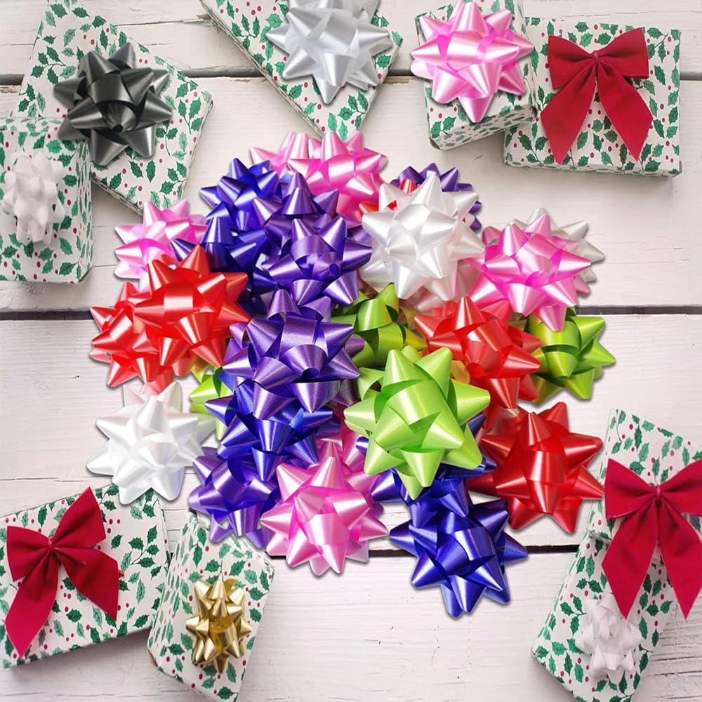 Package includes: Box of 30 pcs 3 inch gift bows. Multi-color mixed packaging, you can freely combine and decorate various gifts and rooms. The color of the star ribbons in each box may be different.