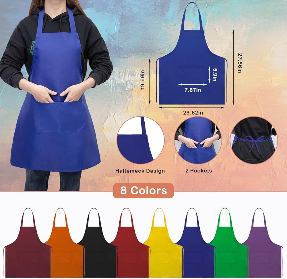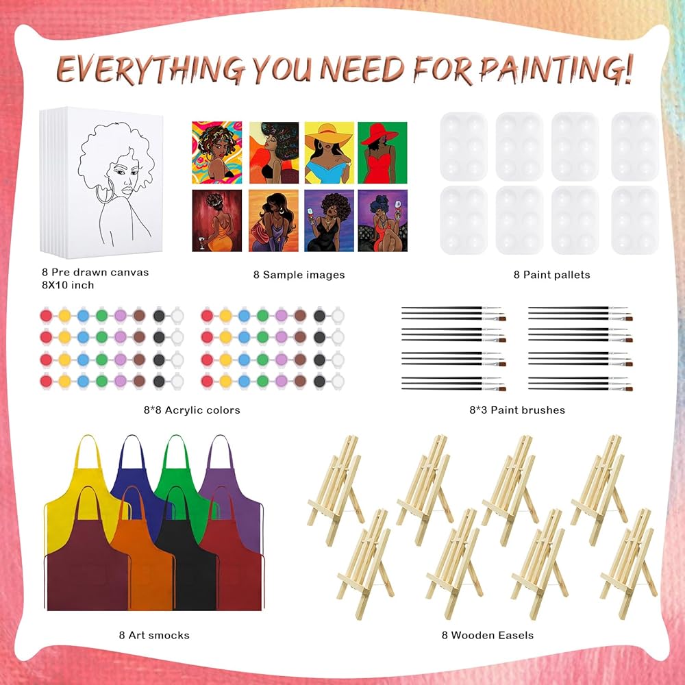 [Paint Party Supplies Content] VOCHIC painting kit includes 8 packs of 8x10 inches pre-drawn canvas, 8 color aprons, 8 tabletop wooden easels, 64 (8 x 8) acrylic colors, 24(3 x 8) paint brushes, 8 pallets, and 8 sample images.