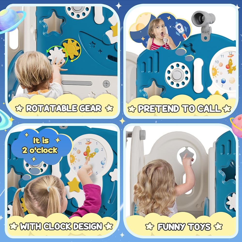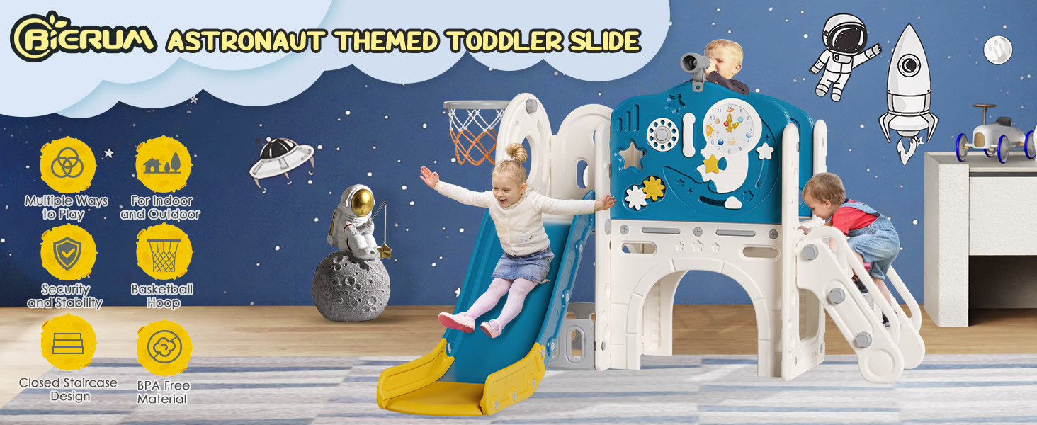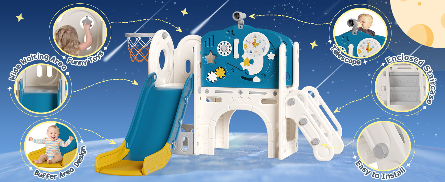 👩🚀 Astronaut theme design: The unique astronaut shape design, with the moon, as well as sliding stars and clouds, stimulates the imagination and provides young explorers with a thrilling experience! There are also small rocket stickers on the back panel to add more fun.