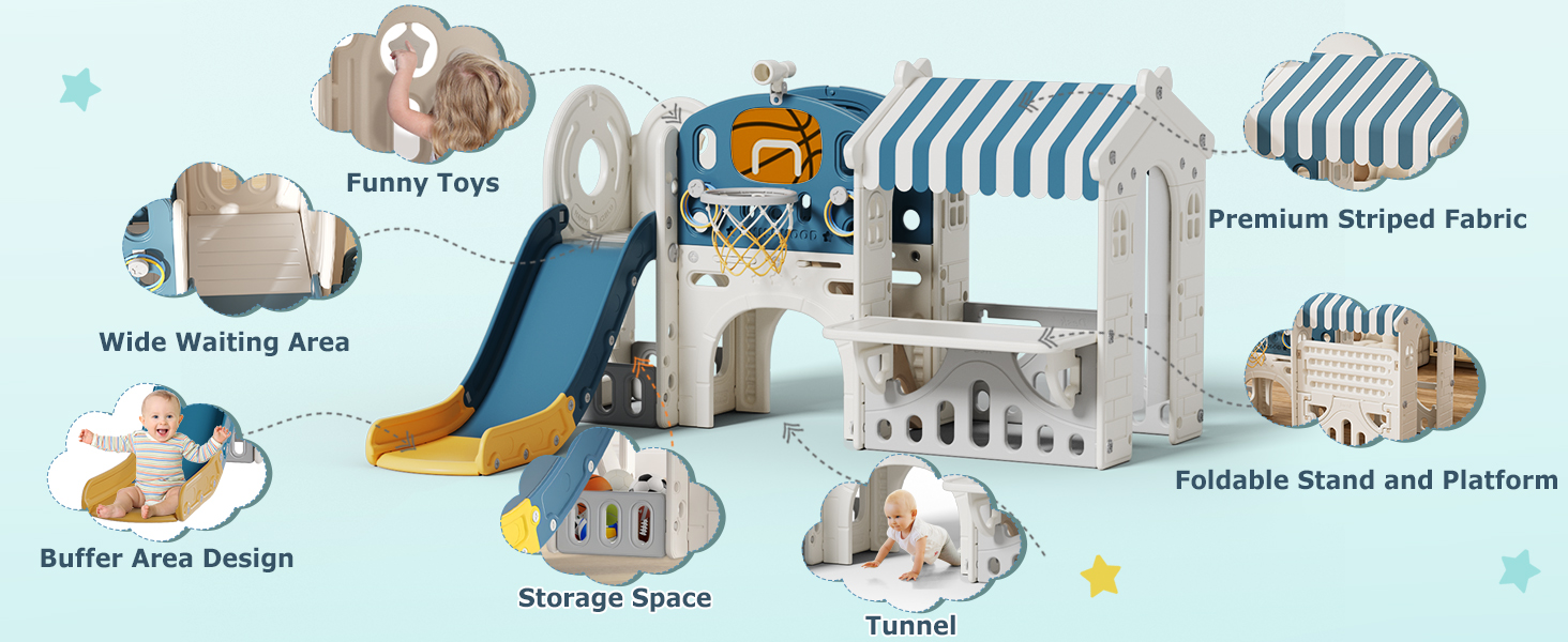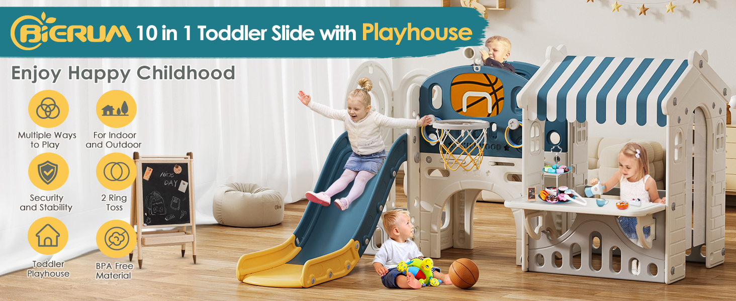 🏀 10 in 1 Activity Center - Baby slide incorporates five activity areas, including the kid playhouse, climber, slide, basketball shooting, and ring toss, and multiple ways to play. These activities promote coordination, adventure, and various forms of play for children.