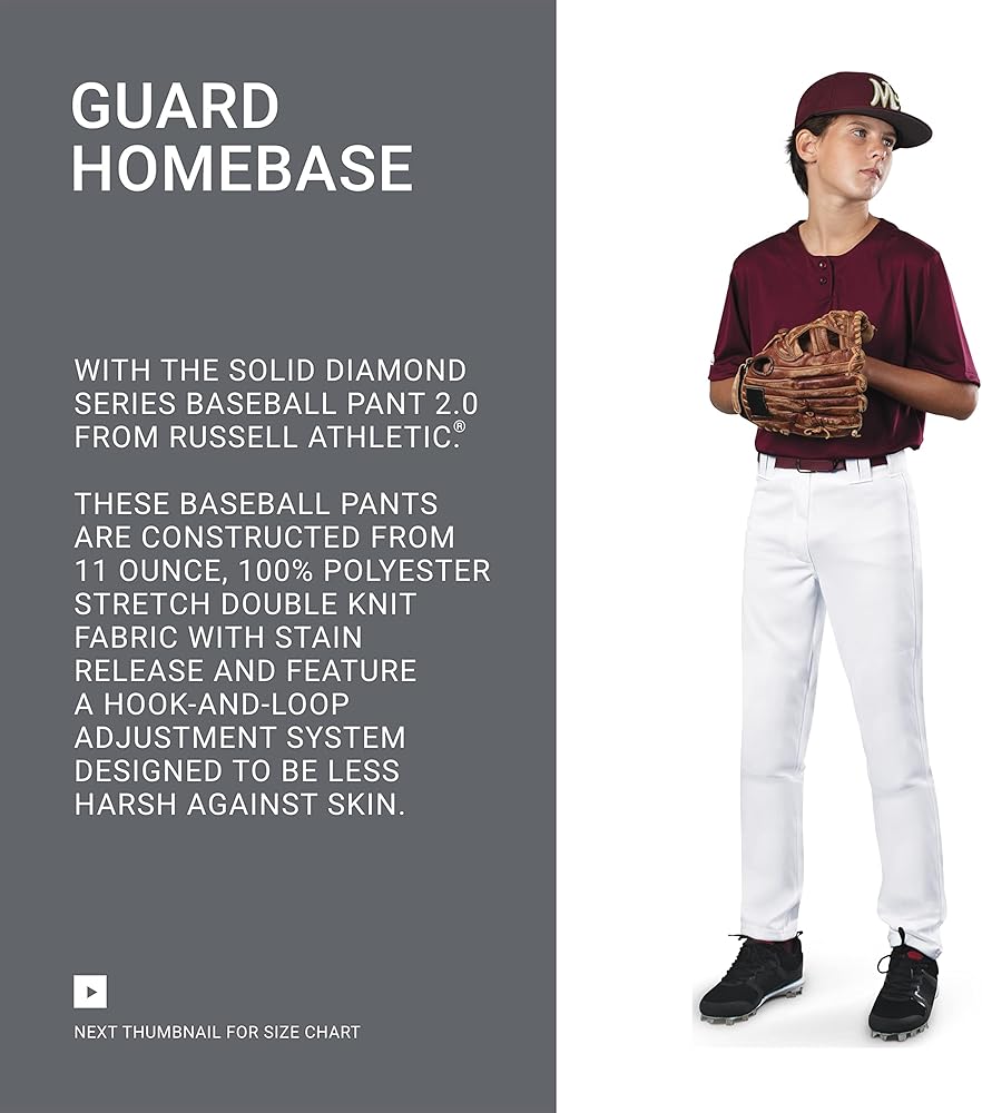 Guard homebase in the Youth Solid Change Up Baseball Pant from Russell Athletic®. These baseball pants are constructed from 11 ounce, 100% polyester stretch double knit fabric with stain release and feature a hook-and-loop adjustment system designed to be less harsh against skin. Reinforced knees and an open bottom provides comfort while out on the field.