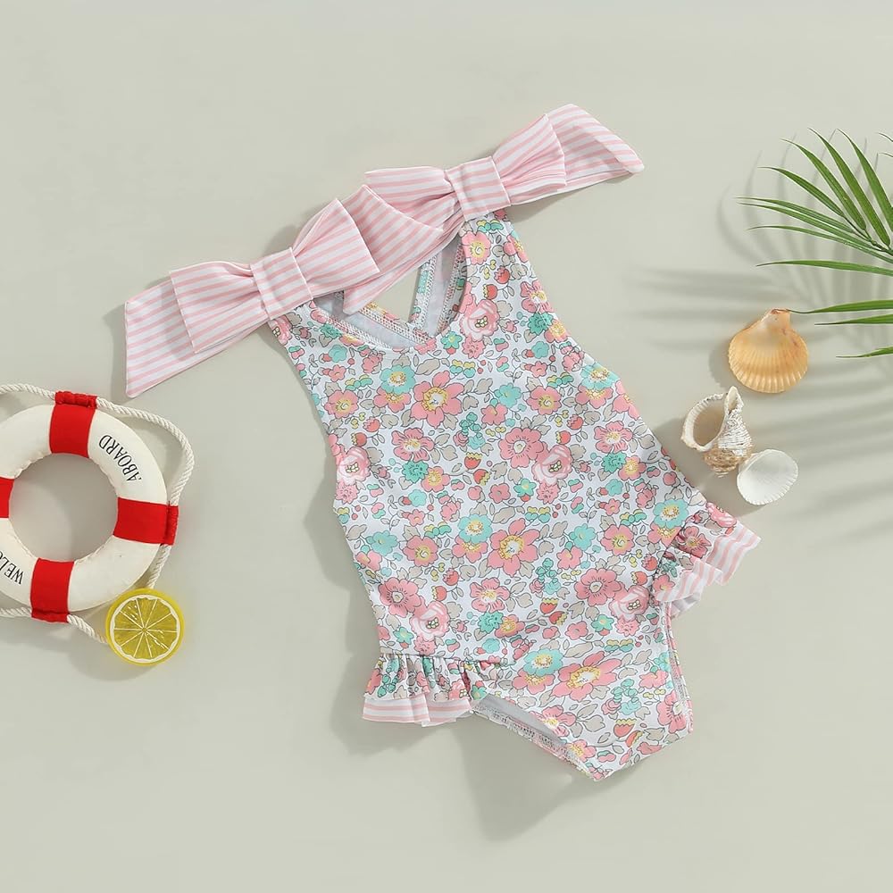 Size: Kid girl swimsuit 4-5t, baby girl swimsuit 12-18 months, baby girl swimsuit 18-24 months, 2-3t swimsuit girls, 3-4t swimsuit girls.Sleeveless, cross backless, ruffles, bowknots, floral print, good stretch. Easy to put on and take off.