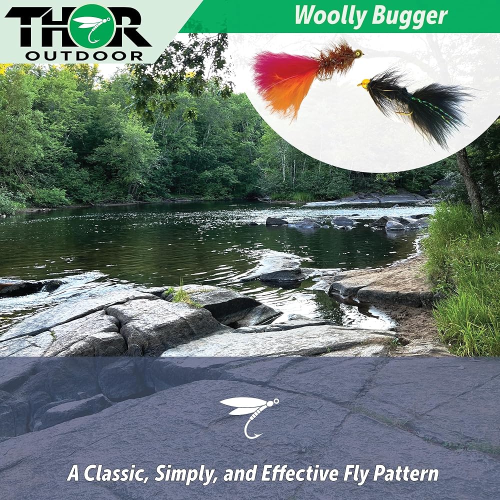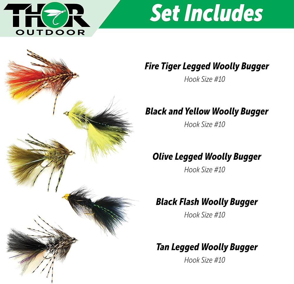 Wooly bugger fly fishing flies are tied on longer hooks and include a marabou tail and chenille body with a hackle (from the head to the tail of the fly). Flash or legs are often added for extra flair and action. Popular freshwater colors include olive, tan, and black. Brighter colors are a good choice for steelhead, salmon, and saltwater.