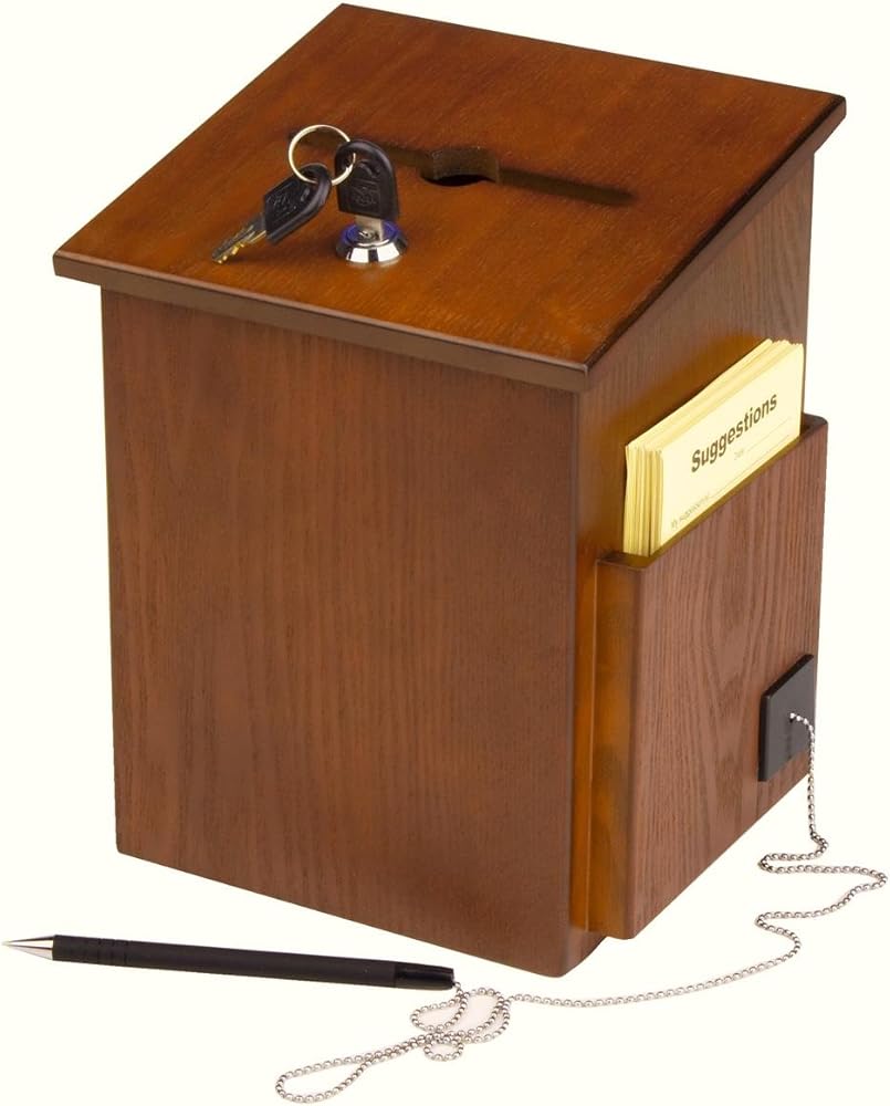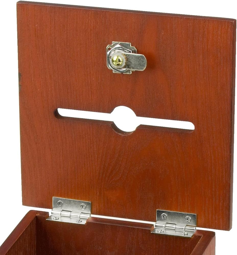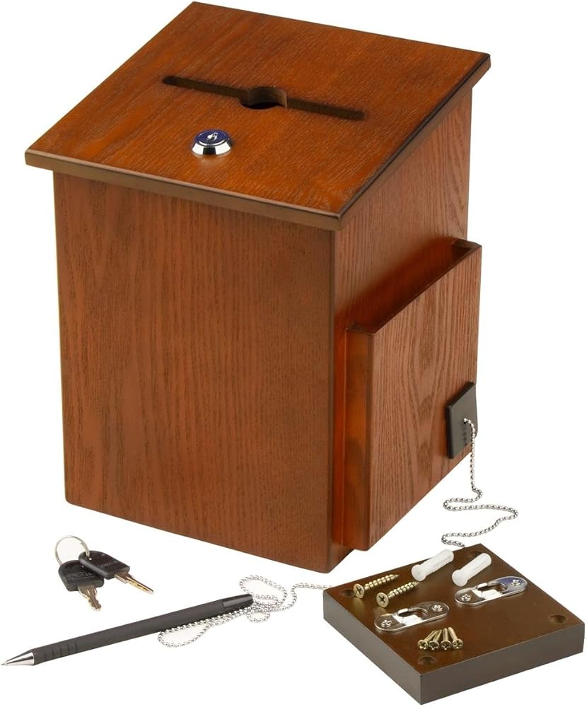 This wood comment box is a medium-sized collection bin, large enough to collect large quantities of ballots, without taking up much counter or wall space. The wooden ballot box is constructed from wood and features a medium oak finish for neutrality. The wood bin also provides confidentiality as participants are not able to see other entries. This wooden comment box is equipped with a locking hinged lid to keep ballots protected. There is also a built-in side pocket for storing unused entry forms (not included). The pocket measures 5.44 inches wide by 5.19 inches tall by 0.625 inches deep. Included with every unit purchased is a security pen with chain. The writing utensil can therefore easily be attached to the unit, the wall or the counter. This wood comment box works well in both corporate and commercial settings. Offices may use this collection bin for anonymous comments or for fundraising events, while a retail store may use it to encourage customers to participate in a raffle. The simple ballot box measures 6.75 inches wide by 9.875 inches tall by 6.5 inches deep.