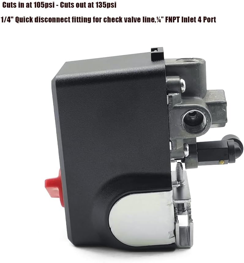 • Spec: Cuts in at 105Psi and cuts out at 135Psi, 1/4" quick disconnect fitting for check valve line, 1/4" FNPT Inlet 4 Port, 120 and 240 Volt, current rating 26Amps.