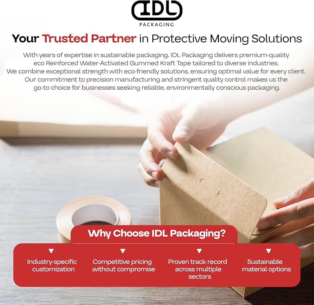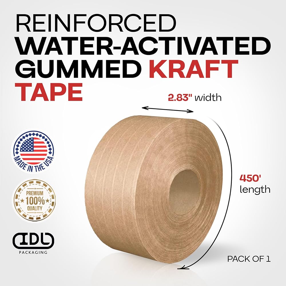 IDL Packaging 2.83" x 450 feet Reinforced Water-Activated Kraft Gummed Tape 30lb Thickness - Secure Paper Packing Tape for Secure Carton Sealing - Heavy-Duty Adhesive for All Conditions, Brown