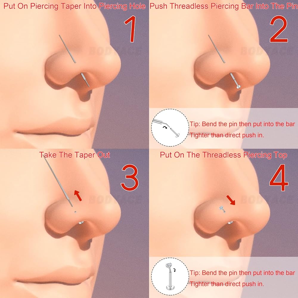 💠Using Instructions💠—1.Put a half part of piercing taper into piercing hole. 2.Push threadless piercing bar into the pin of the taper, then push through totally piercing hole slowly and softly. 3.Take the taper out of the hole and let the threadless bar stay. 4.Put on the piercing top or bottom.