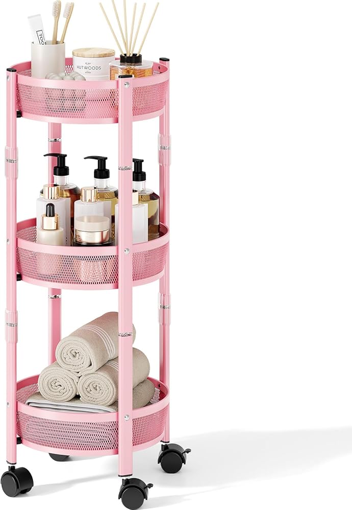 ✔ PREMIUM MATERIAL - The round rolling storage basket on wheels is made of thickened steel tube with smooth powder coating, which is anti-rust and durable. The mesh design of the wire basket give more air ventilation, allowing for natural ripening and keeping the fruits and vegetables fresh.