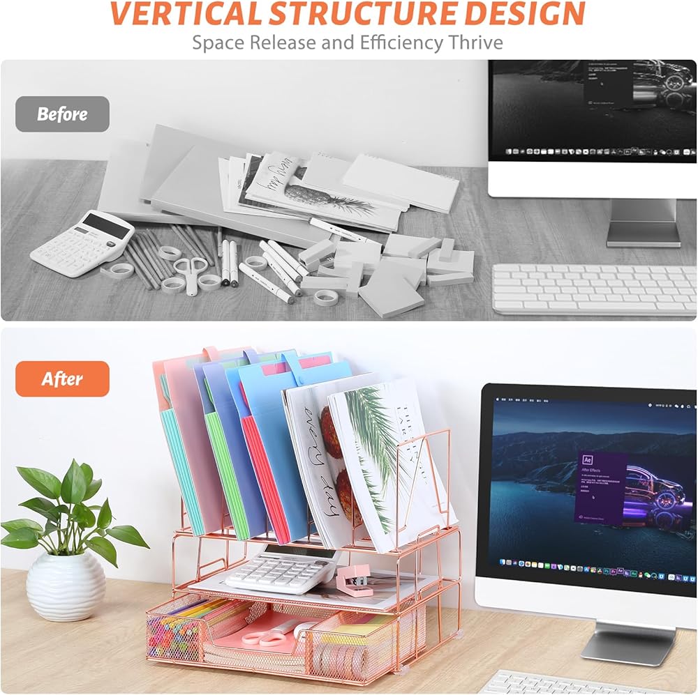 【Ample Storage】The various compartments and slots of the rose gold desk organizer provide ample storage space for files, stationery, cosmetics, and other office supplies, transforming your workspace into a more efficient and aesthetically pleasing environment.