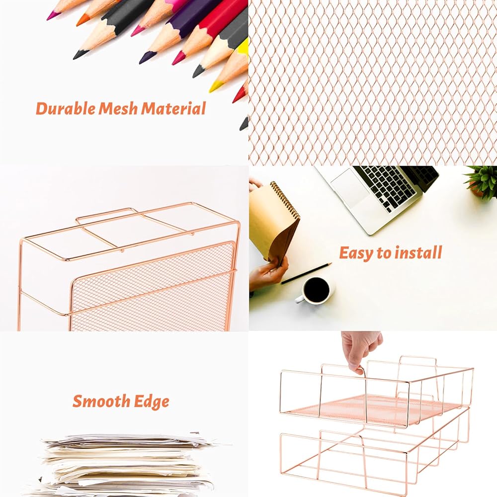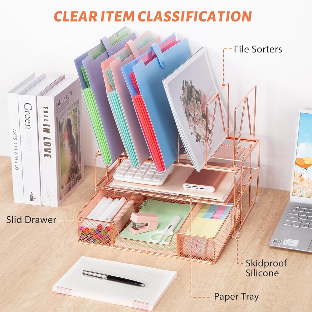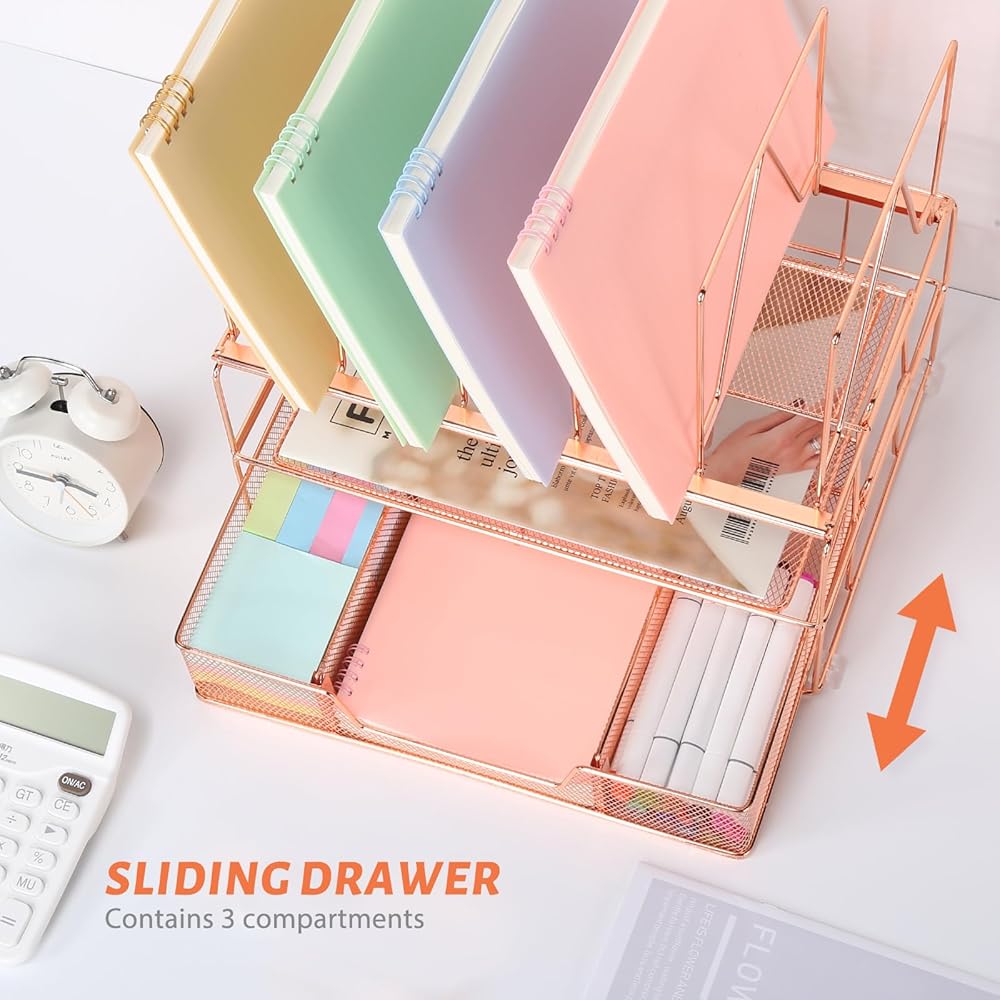 Housmile Rose Gold Desk Organizer, Office Supplies for Desk, 3-Tier File Organizer with Sliding Drawer, Paper Letter Tray, File Sorters and Anti-slip Silicone, Rust-proof, Stable and Strong