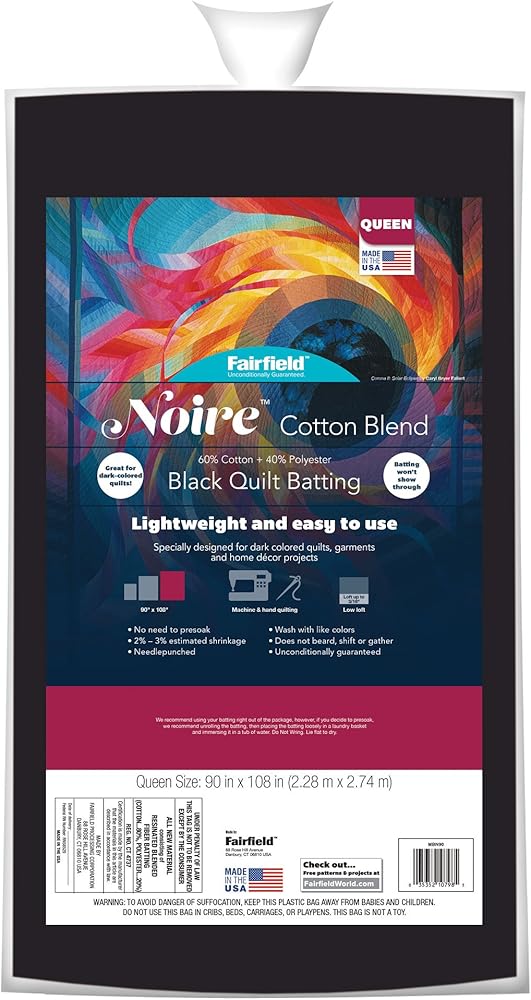 Enhance your quilting projects with Fairfield's Noire Cotton Blend Batting! The 60% cotton and 40% polyester blend quilt batting is perfect for long arm, short arm, and domestic machine quilting and features a thin scrim for added strength. The lightweight, needlepunched, low-loft batting is a favorite for machine quilters, as it retains its softness even when densely quilted and does not show through the projects. Yielding a flat appearance, this batting does not beard, shift, or gather. The cotton holds the fabric securely to the batting and prevents bumps on the underside of the quilt and aids in avoiding creases when the quilt is folded. Safe for use, this quilt batting is ideal for a wide variety of projects, including clothes, quilts, and home decor projects. Craft with confidence, as projects created using this batting remain washable after quilting, ensuring long-lasting maintenance; the shrinkage is only 2–3%. Wash with like colors. Unleash your creative spirit and elevate your creations with this strong, resilient quilt batting. It measures 90" x 108" and the loft is 3/16", with the recommended quilting distance being up to 8". Fairfield Noire Cotton Blend Batting is made in the USA.
