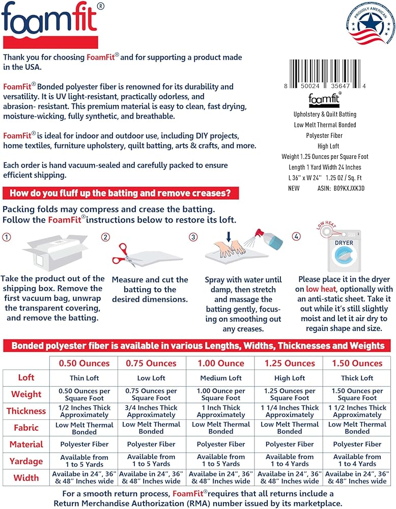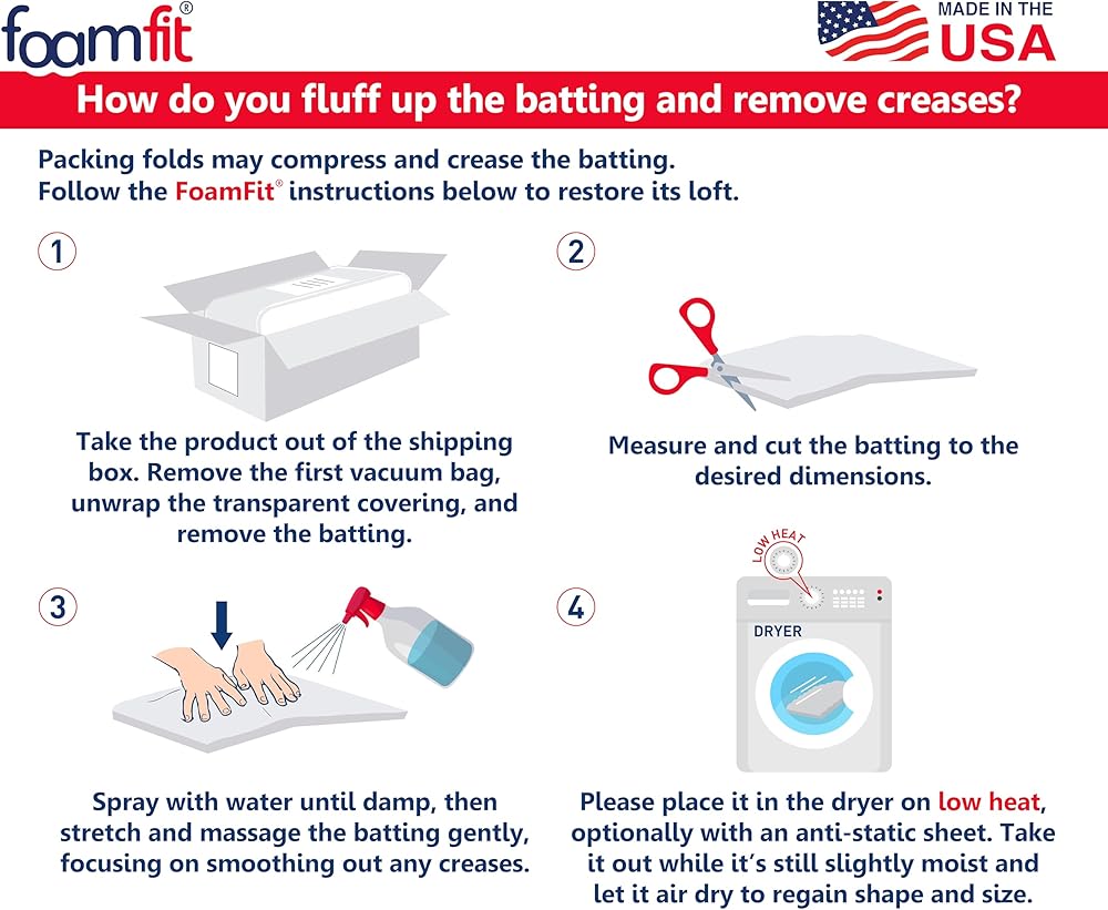 It is easy to work with and has several uses. Renew the appearance of upholstery projects. Wrap seats and cushions to reduce wear to fabric from the foam friction or filler for couch cushions for smoother edges and crown-looking. Fill throw, bolster, lumbar, and box pillow. It is UV-resistant and breathable for restoring outdoor or indoor furniture, or you can use it as padding for a softer look on motorcycles, cars, boats, airplanes, golf carts, and RV seating. Replacement for filters and aquarium filtration systems. Restore gowns, filling in jackets, cold clothing, baby blankets, and cribbing. Great for DIY projects, bedding quilts, event decorations, making stuffed animals fluffy, or filling jewelry boxes. Wrap around delicate glass or ceramic for an extra padded layer of protection
