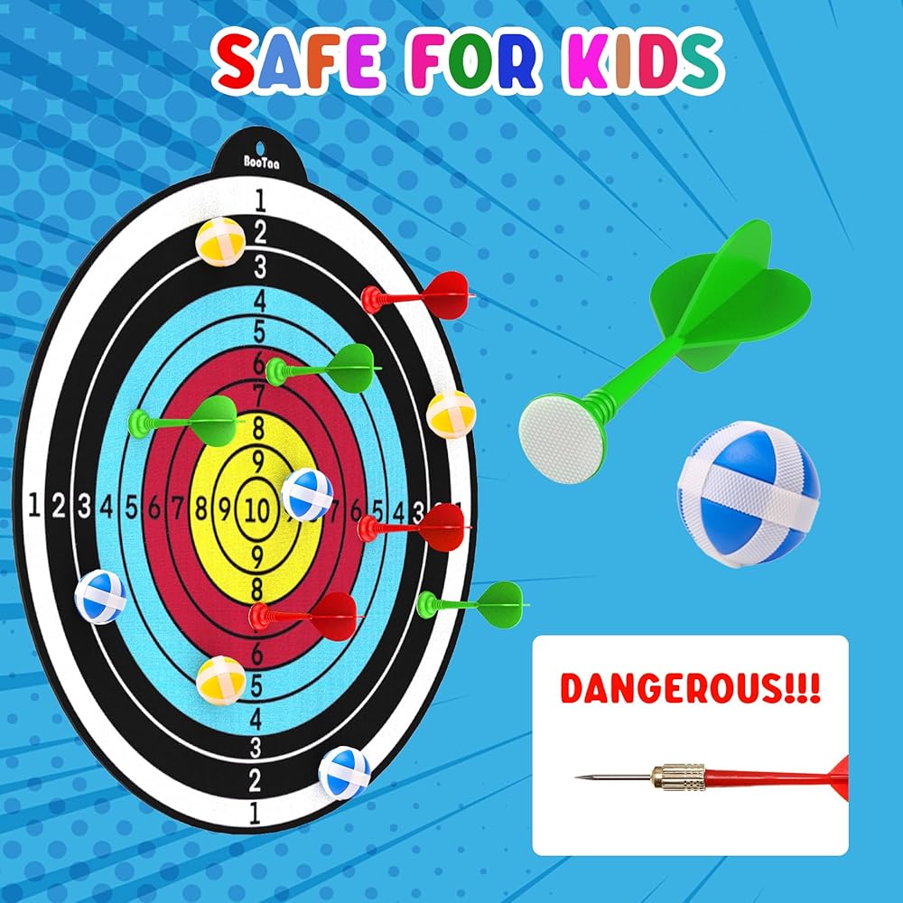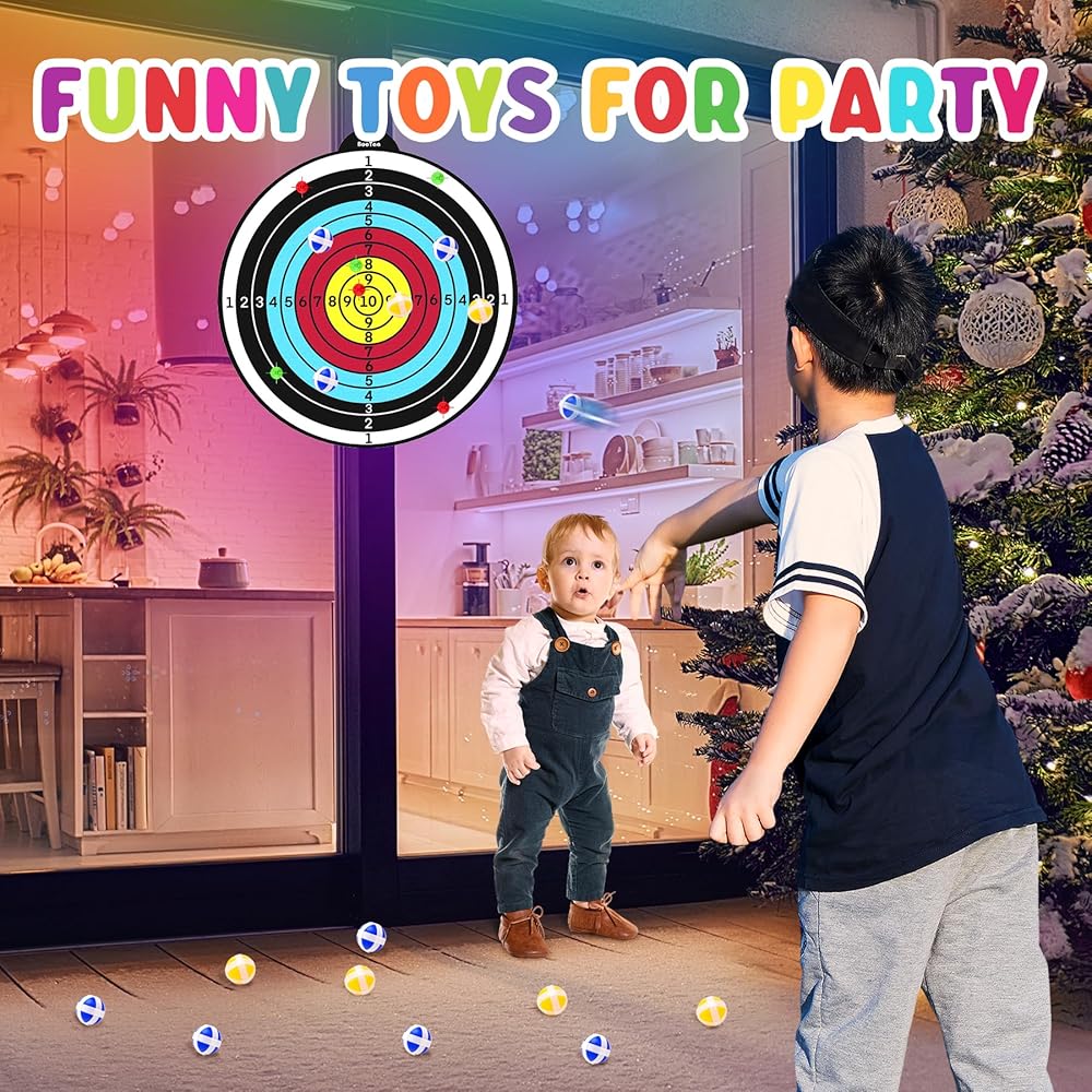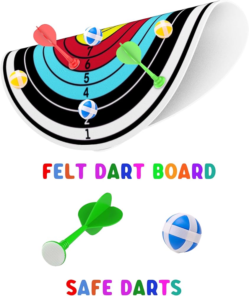 SAFE MATERIAL & EXTRA HOOK --- All the sticky balls have no sharp parts, safe for kids. The toy dart board can be easily mounted indoor or outdoor. Just simply hang up the dartboard and you can enjoy the game. Enough accessories for friends to play together. Stress relief toy for kids, adults.