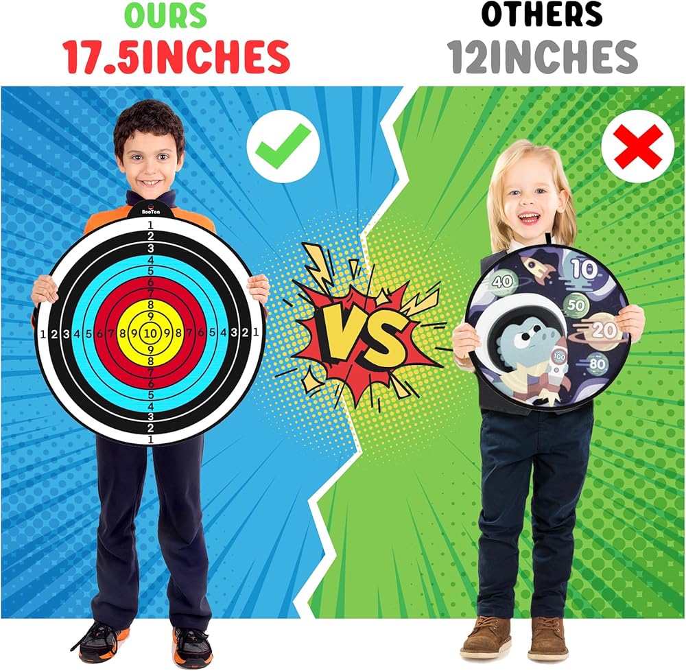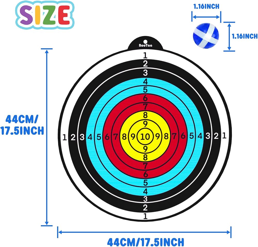 2 PACK 17.5" LARGE DART BOARD WITH 6 DARTS, 6 STICKY BALLS --- Dart board's diameter is 17.5 inches, large size means higher hit rates and more fun for kids/ beginners. The dart board toy set is made of high-quality soft fabric, durable. Plastic sticky balls have strong stickiness. Package include: 2* dart board, 6* darts (2 colors), 6* sticky balls (2 colors), 1* hook. With these abundant accessories, you are allowed to enjoy the fun of the activity with more players.