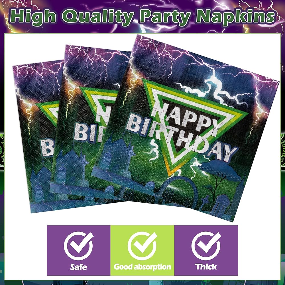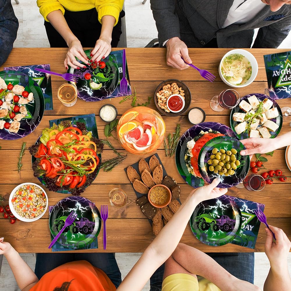 SERVE 24 GUESTS: You will receive 24 9" monster truck themed paper plates, 24 7" monster truck themed paper plates, 24 monster truck themed napkins and 24 plastic purple forks, making it easy to serve a group of 24 guests.