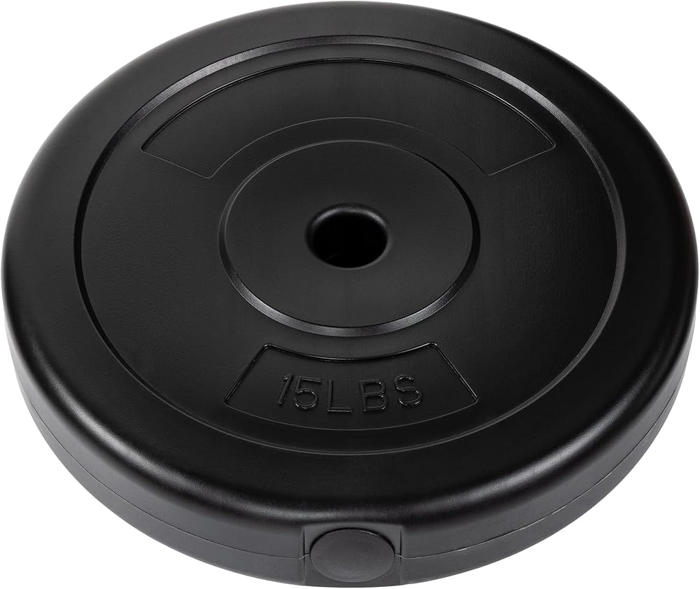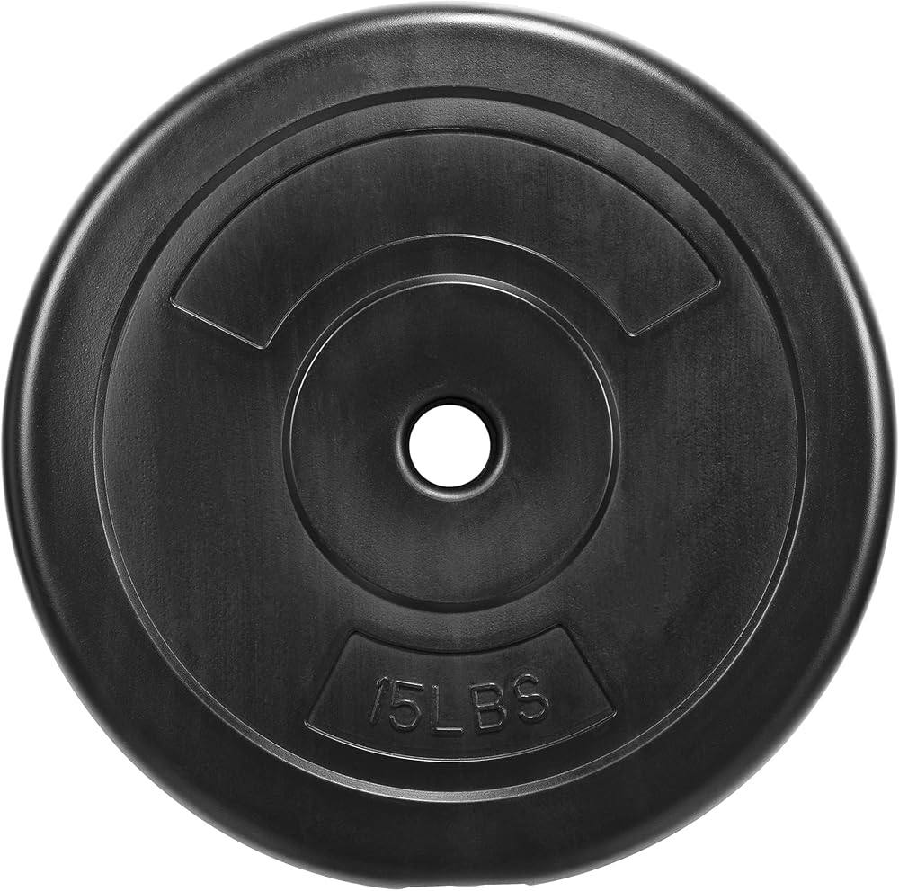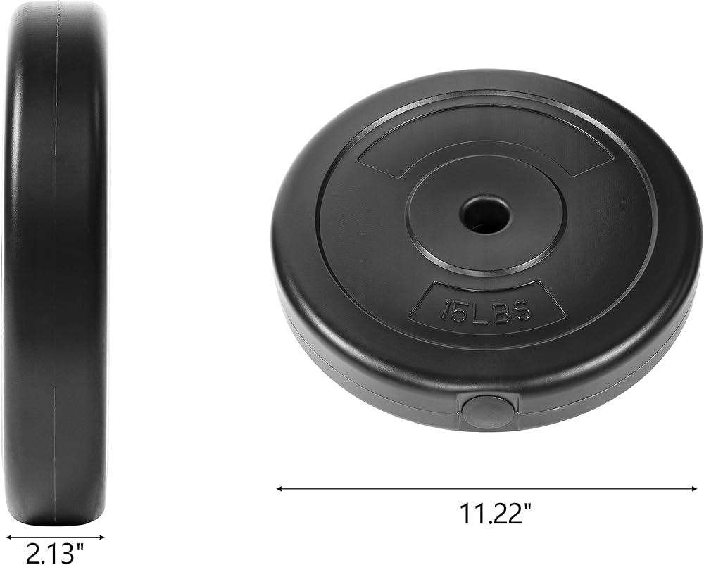 - Made of thick vinyl shell filled with cement with a 1-inch center hole fits any Standard bar with diameter 1” or less