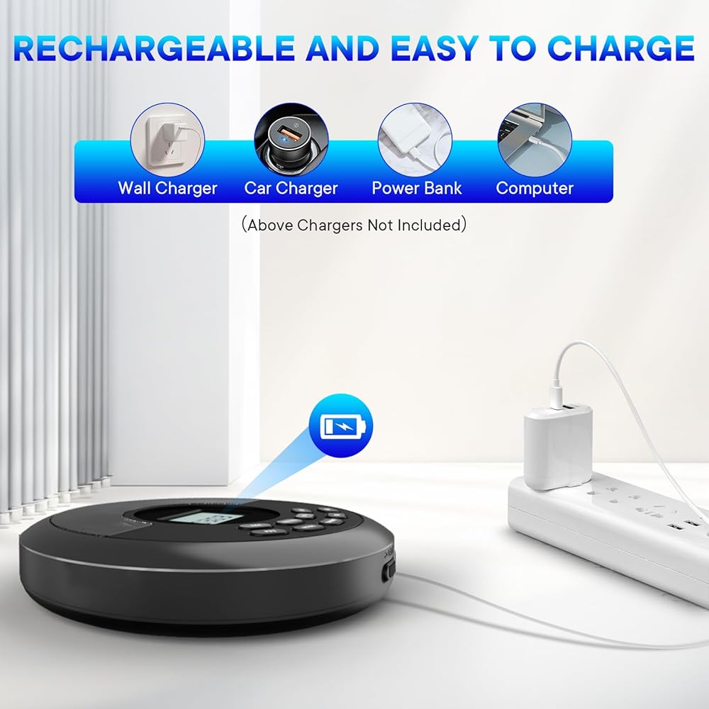 【Rechargeable cd player with type C charging port】This portable cd player walkman does not consume batteries,we do not neet to connect to power all time.Fully charge this cd music player,we can use it anywhere for 5~8 hours.Turn off this cd players for home small timely in order to not run out battery.