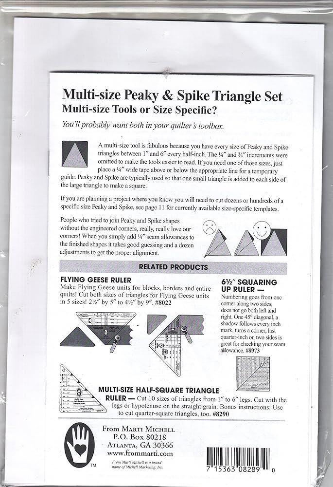 The Multi-size Peaky and Spike triangle tools (2 pieces to cut 2 shapes) makes it easy to cut any size Peaky and Spike triangle set from 1 to 6 inches by half-inch sizes. You can trim the engineered corners, just like those available in exact-size templates From Marti Michell. With this multi-size tool, you can audition different size triangles. It's quite economical because you can cut 11 different sizes this one tool set. Companion tools (sold separately) are the Multi-Size Half-Square Triangle Ruler #8290 and the My Favorite Squaring Up Ruler #8973. The late Doreen Speckmann named these shapes Peaky and Spike, and the names became famous around the world.