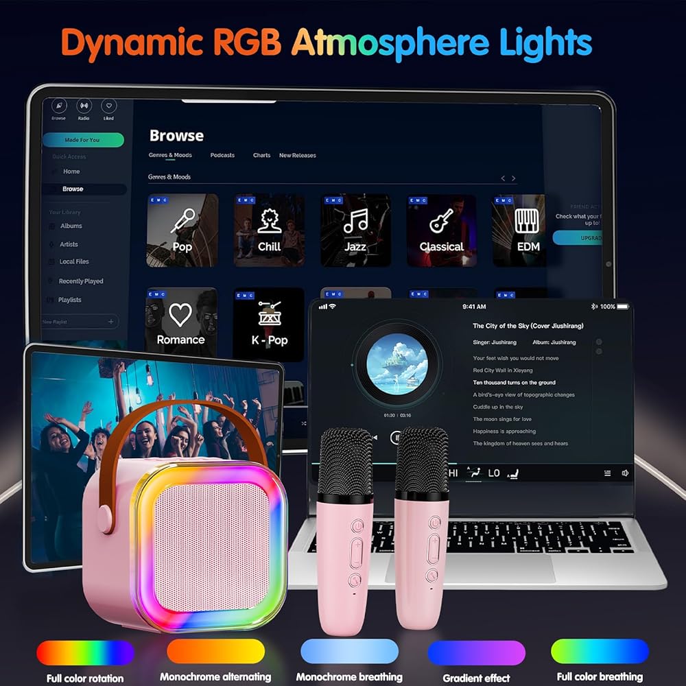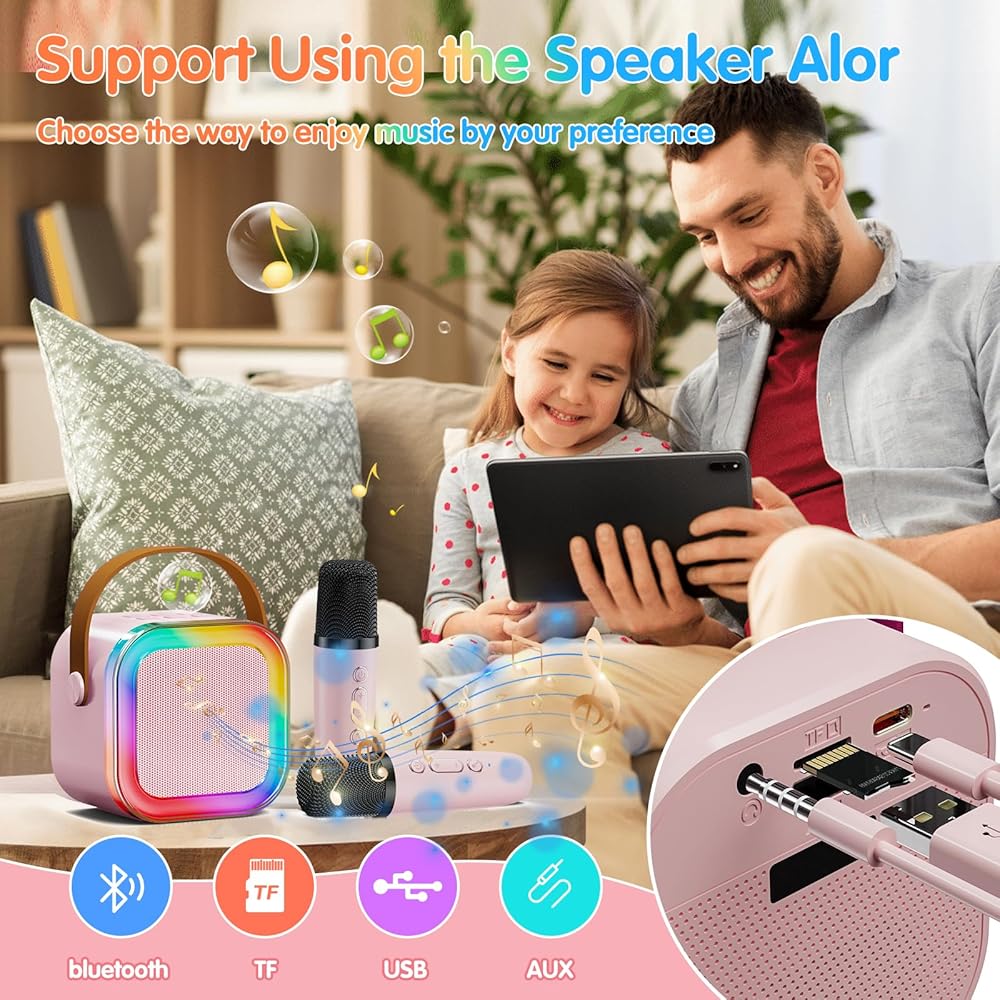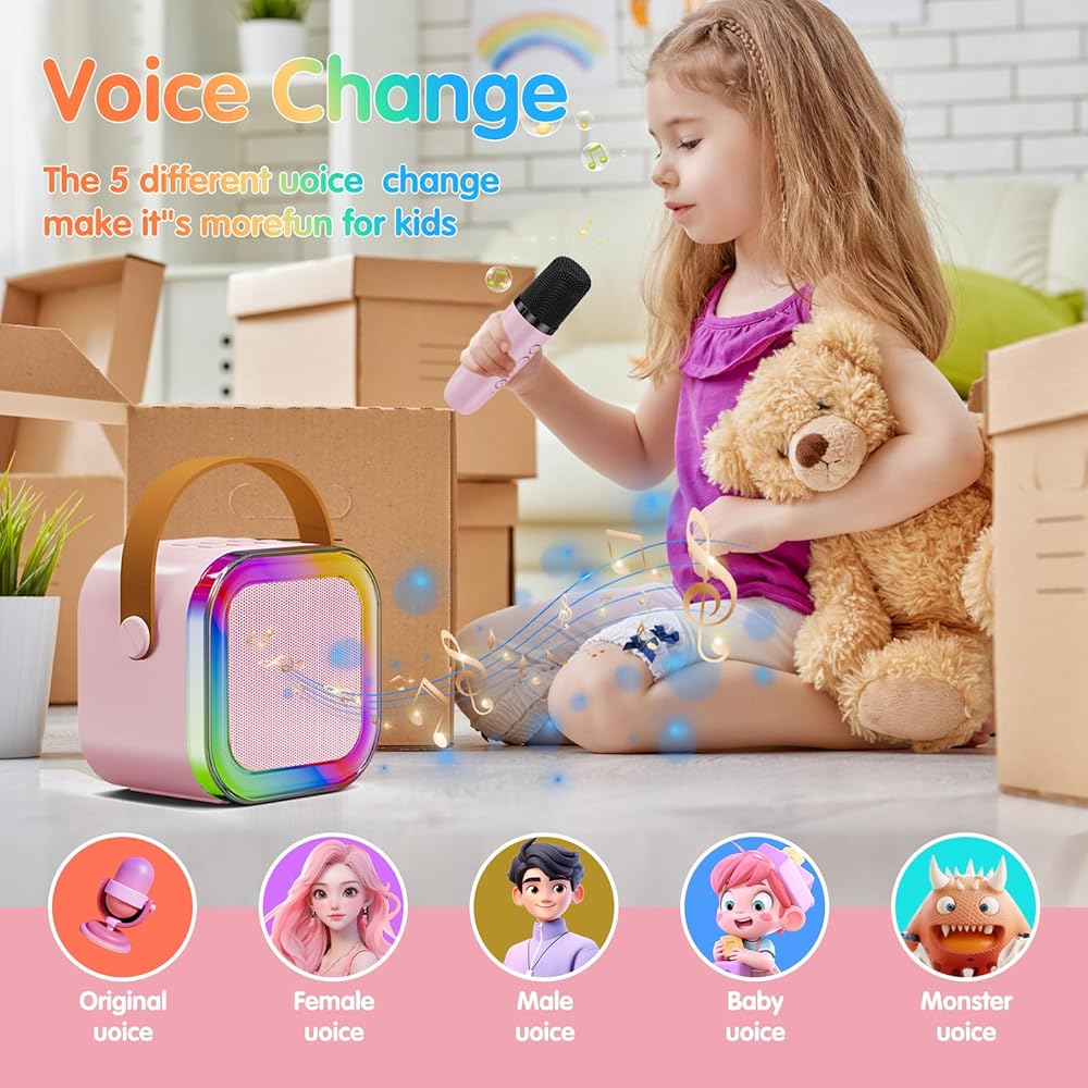 ♫【Fun Voice Change & Multi-Colored LED Lights】Kids karaoke machine has 5 amazing voices (magic voice, baby voice, female voice, male voice and original voice). Karaoke machine features four modes of dazzling and colorful LED lights, creating a captivating atmosphere.