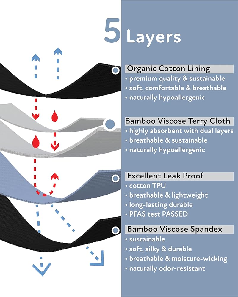 Luxurious Materials for Safety and Sustainability: Indulge in luxurious comfort with our period underwear crafted from premium materials. The combination of rayon derived from bamboo, terry cloth - rayon derived from bamboo, cotton TPU, and organic cotton for the crotch lining offers a safe, soft, and sustainable option. Enjoy breathability, unmatched softness, and the ultimate comfort you deserve.