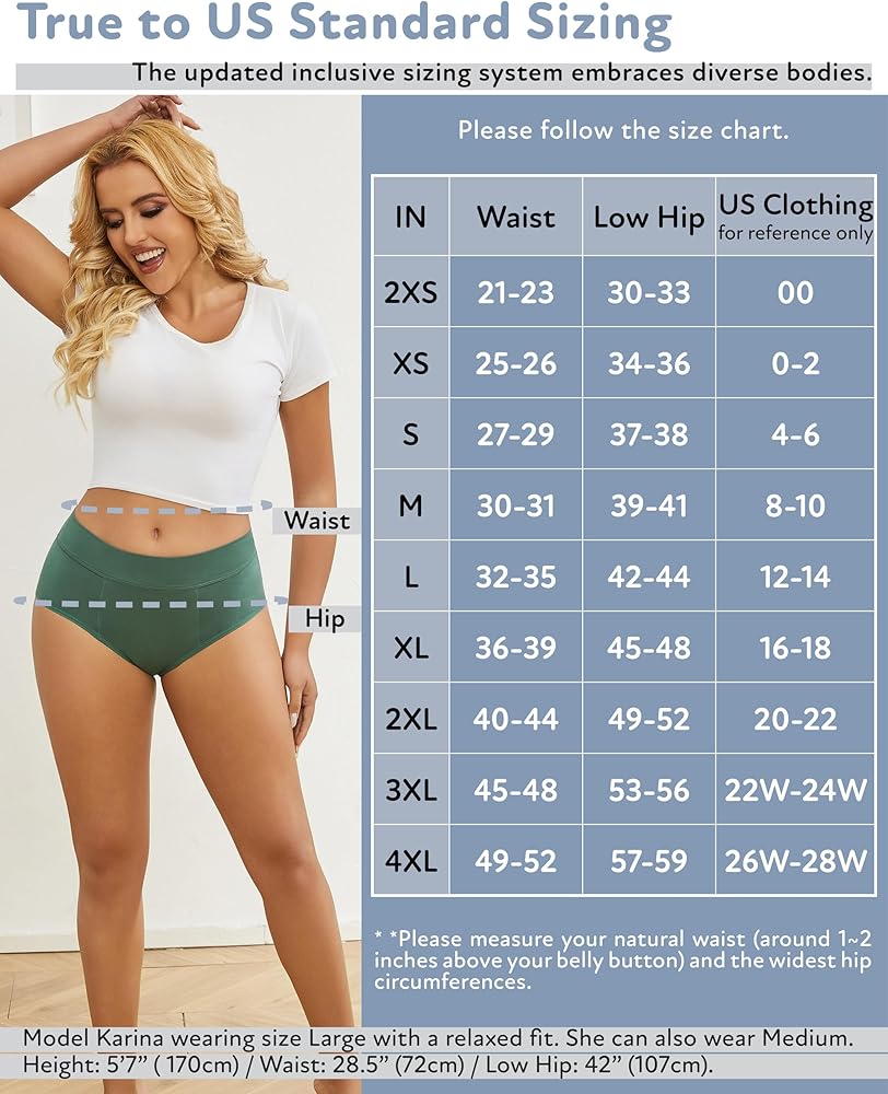 Advanced Sizing System, Including Plus Sizes: We've got you covered with our advanced sizing system, accommodating a wide range of body types. Our period underwear is designed to offer a comfortable fit that aligns with US sizing standards. Refer to our size chart for guidance, and rest assured that sizing up is not necessary.