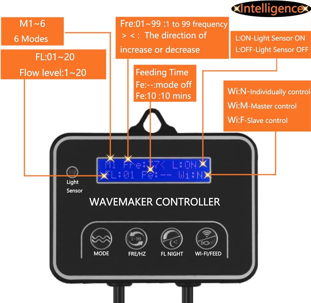 【6 Mode Grade 20 Strength Level 99 Frequency】 With smart LED display controller, can set multiple wave mode, flow mode, feed mode, master and slave control modes.Create various types of water flow to make the fish healthier and happier.