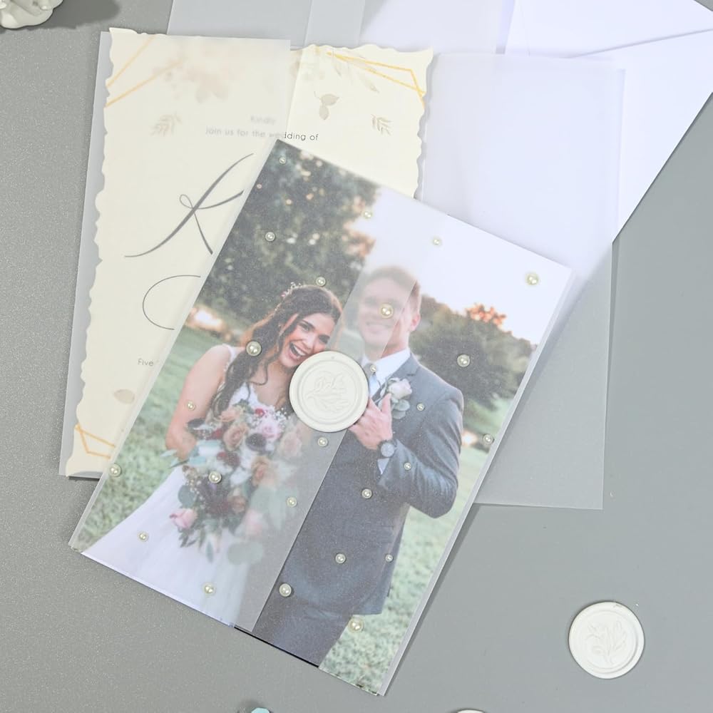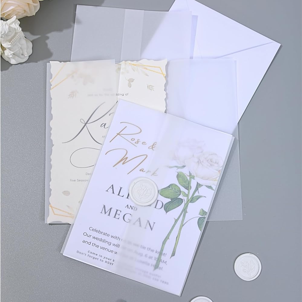 Versatile: The translucent vellum jackets are an elegant and luxurious detail to tie a set of invitations together. They look great with or with wax seals or ribbons The translucent vellum papers also can be used for an upcoming bridal shower, baby shower, or birthday party.