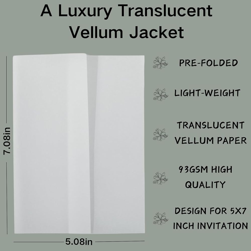 Vellum Jackets: Includes 100 Pre-folded sheets of vellum paper for 5x7 (127x178mm) invitation. We make it super easy for you, just slot in your invitation, no extra effort needed.