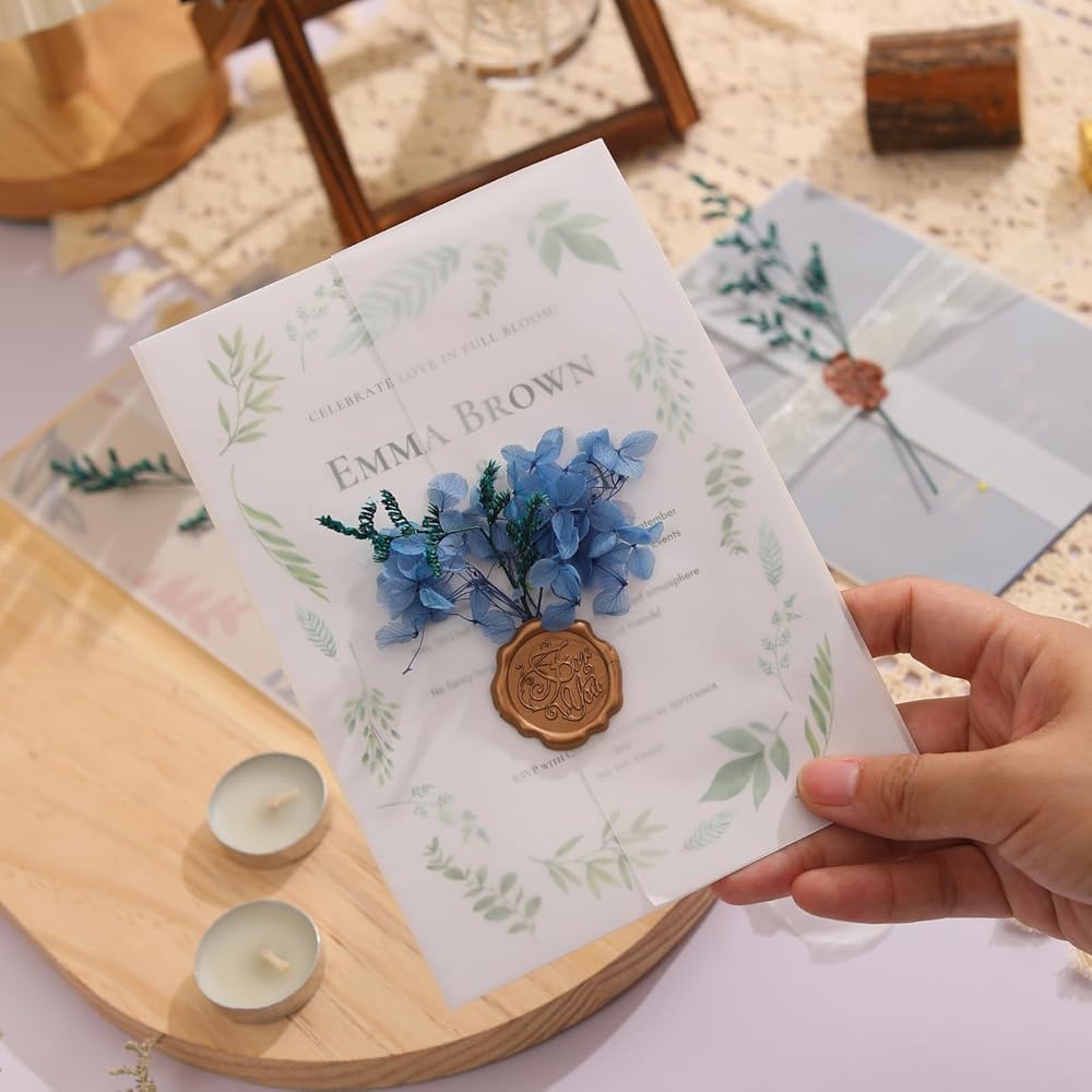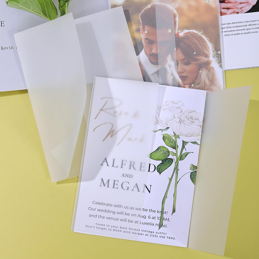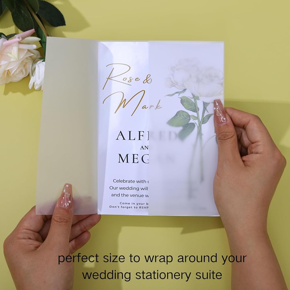 What's Included: a bulk quantity of 100 pre-folded vellum jackets; The design is smooth and The translucent, very suitable for DIY. Decorate with wax seals, stickers, or ribbons according to your own ideas, making the invitation letter more attractive for weddings or special event invitations.