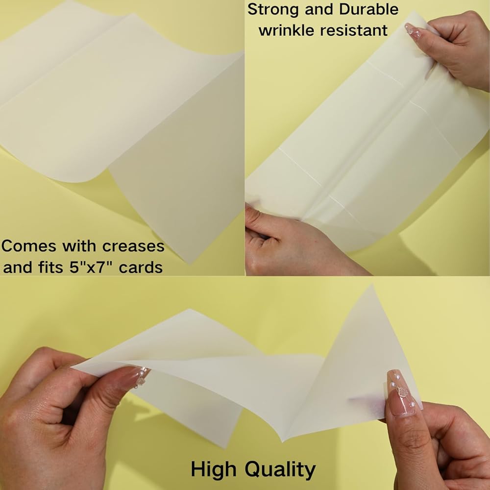 Quality Material: Our Vellum jackets are made with 93gsm translucent clear vellum paper.These vellum wraps are heavy and perfect for holding 5" x 7" event invitations or a suite. The vellum paper sheets are pre-folded into 3 sections to ensure all-around protection for all of the contents。