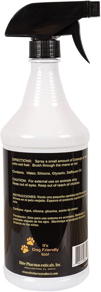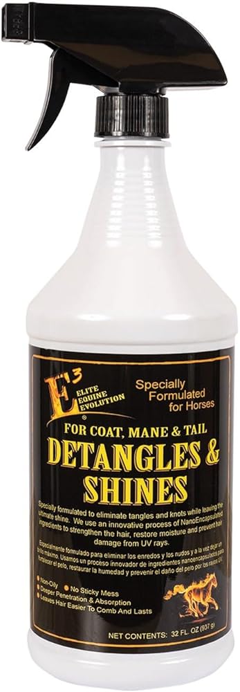 E3 Elite Equine Evolution Detangles & Shines Specially formulated for horses' coat, mane and tail, the Detangles & Shines eliminates tangles and knots while providing the ultimate shine. An innovative process called Nano Technology, provides NanoEncapsulated ingredients that restores moisture as well as strengthens the hair. It can also prevent damage from UV rays. Features: Non-oily Non-sticky Deeper penetration and absorption Leaves hair easier to comb Item Specifications: Ingredients: Water, Silicone, Glycerin, Safflower Oil Directions for Use: Spray a small amount onto wet hair. Brush through.