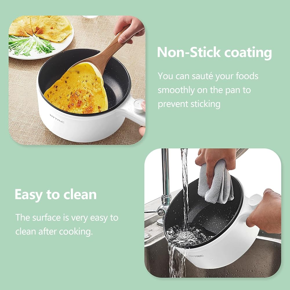 Healthy Non-Stick Coating - Hytric electric ramen cooker surface is made of food-grade nonstick coating which has the features to provide an effortless release and easy cleaning. You can sauté your foods smoothly on the pan to prevent sticking and cook foods at a low level of fat and oil to make your foods healthier. After cooking, easy clean up the surface with water and a rag.