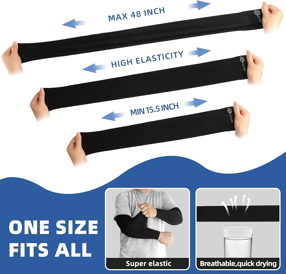 【Breaking the Conventional Elasticity】We add elastic fiber to the traditional sleeves, which greatly increases the elasticity of the uv arm sleeves for men. Sleeves to cover arms can meet the needs of different groups of people. The length of the sun sleeves can be stretched from 15.5 inches to approximately 48 inches, and the sleeves is 360° integrated, there are no seams throughout the long arm. No matter your arms are thick or thin, you won't feel uncomfortable due to strangulation marks.