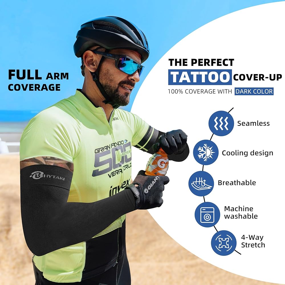 【Many Features】Our arm sleeves for men women are added with anti-UV ingredients, which can truly block ultraviolet rays and prevent skin sunburn and aging. In addition to UPF50+, our compression sleeves also have high elasticity, anti-pilling, covering tattoos, non-fading, moisture-wicking, non-slip, chemical-free,etc. We carefully polish the quality of the compression arm sleeves for men women to create unique BHYTAKI arm sleeves, so that you can use them with peace of mind and satisfaction.