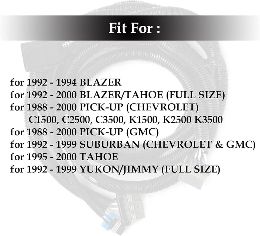 - 【Fitment】The rear tail light wiring harness fits for 1992 - 1994 BLAZER, for 1992 - 2000 BLAZER/TAHOE (FULL SIZE), for 1988 - 2000 PICK-UP (CHEVROLET) C1500, C2500, C3500, K1500, K2500 K3500, for 1988 - 2000 PICK-UP (GMC), for 1992 - 1999 SUBURBAN (CHEVROLET & GMC), for 1995 - 2000 TAHOE, for 1992 - 1999 YUKON/JIMMY (FULL SIZE).