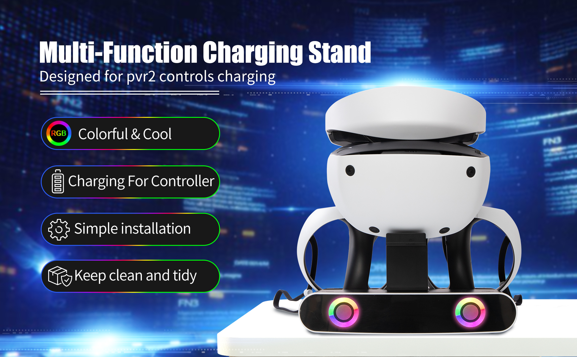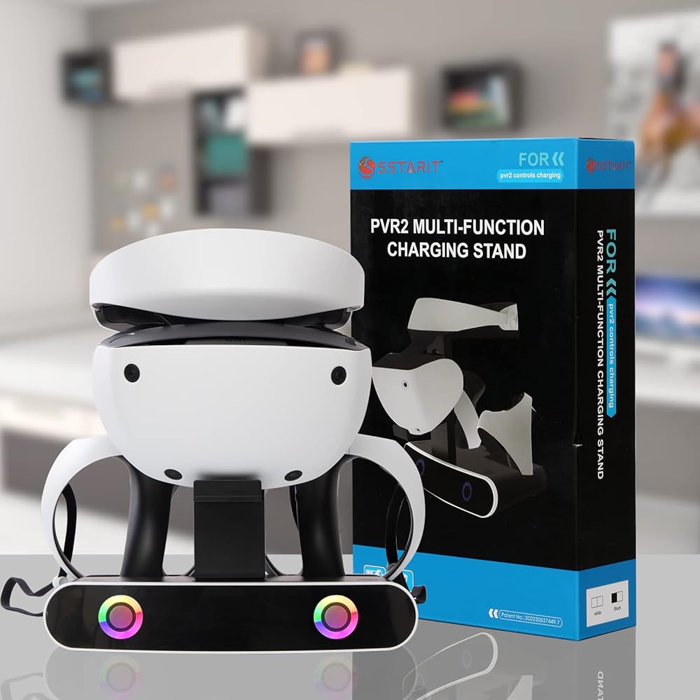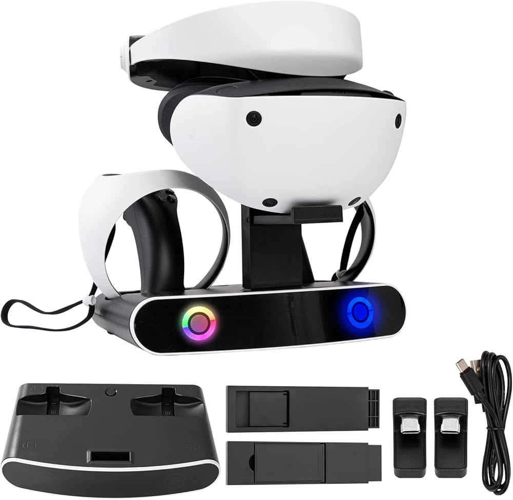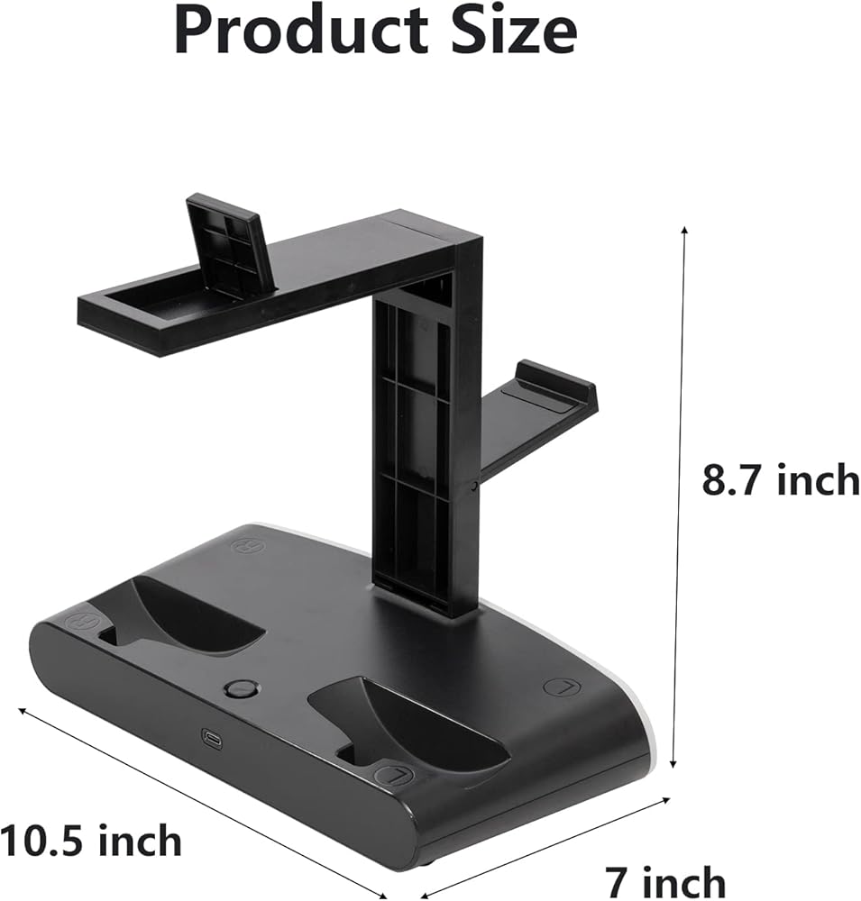Organization Made Easy: Keep your accessories organized and in one place with our PS VR2 Charge Station and Stand. The charging stand is perfect for holding your headset and a pair of PS VR2 controllers, ensuring that all your PS VR2 accessories are neatly stored away.