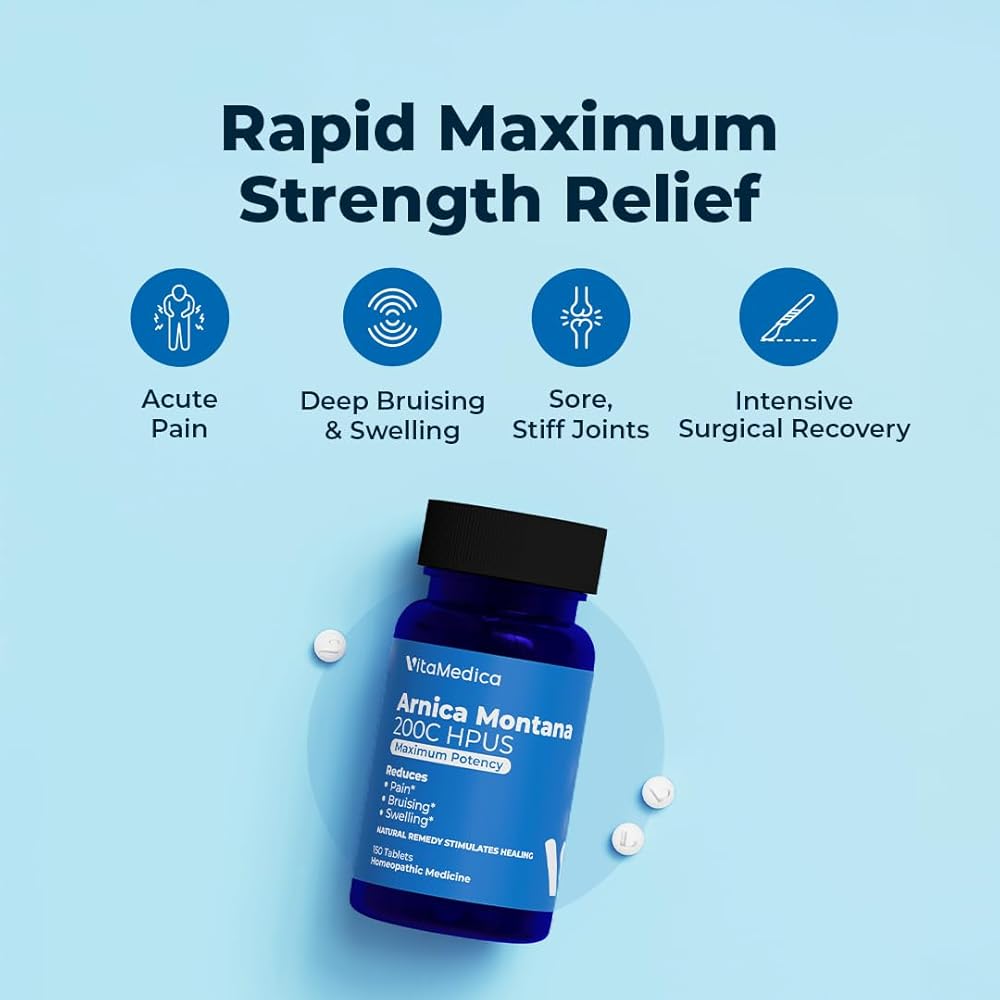 CLINICAL-STRENGTH NATURAL PAIN SUPPORT: Soothe muscle pain, aches, bruising, swelling, and stiffness with VitaMedica's botanically-derived, chemical-free, natural arnica tablets. Blending modern science with holistic wisdom, our Arnica Montana 200C tablets are sourced from real Arnica Montana flowers using standard homeopathic processes guided by the FDA.