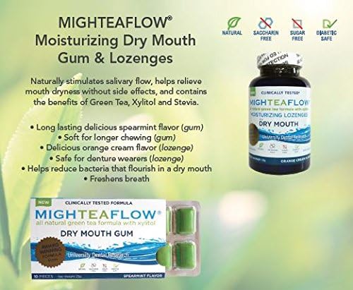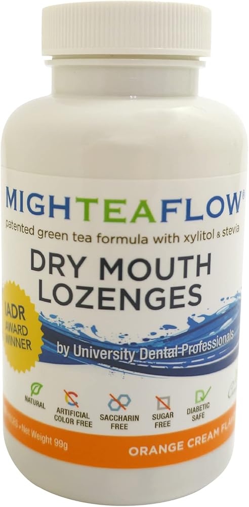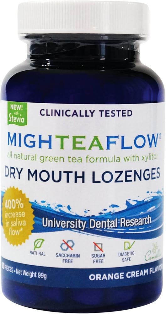 MighTeaFlow utilizes cutting edge research coupled with EGCG green tea technology to produce a revolutionary method for dry mouth management. MighTeaFlow is the only dry mouth formulation developed by dental professionals. With more than a decade's worth of research and a two year clinical trial conducted at the Medical College of Georgia's College of Dental Medicine, MighTeaFlow has proven to be the most effective formula to treat dry mouth, restore salivary function, and balance saliva pH from acidic to neutral. The patented MighTeaFlow formula has been recognized by the International Association for Dental Research in association with GlaxoSmithKline with the prestigious Innovation in Oral Care Award MighTeaFlow dry mouth management includes five products-GUM, LOZENGE, ORAL RINSE, ORAL SPRAY, and ORAL GEL. Developed by dentists, scientists and hygienists using the clinically proven* natural green tea/xylitol formulation that Increases one's own saliva by up to 400% Naturally normalizes salivary pH to neutral Helps prevent tooth decay and enamel erosion Restores salivary function and protects gland cells Provides antioxidant benefits as 1 dose equals 1 cup of green tea Contains Xylitol, the natural sweetener preferred by dental professionals Sweetened with Stevia. The lozenge is NO sugar, saccharine, yeast, milk, egg, soy, wheat, artifical colors or added preservatives. Safe for diabetics Provides a long lasting, slow release method for relieving dryness. Safe for denture wearers and helps inhibit bacteria growth Light orange cream flavor and freshens breath. Recommendation is to take a sip of water with the lozenge to help the dissolving process, or one may chew the lozenge. Allow the lozenge to alternate between cheeks and tongue to provide a thorough coating.