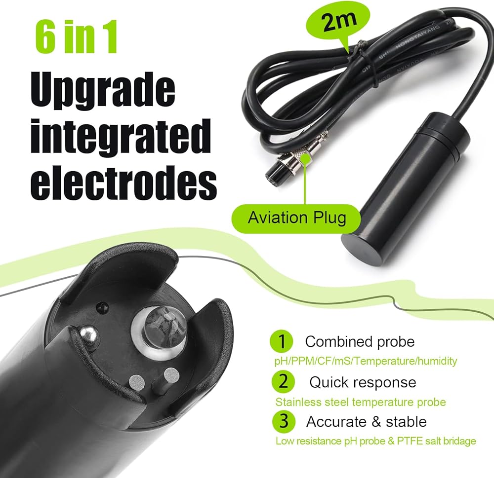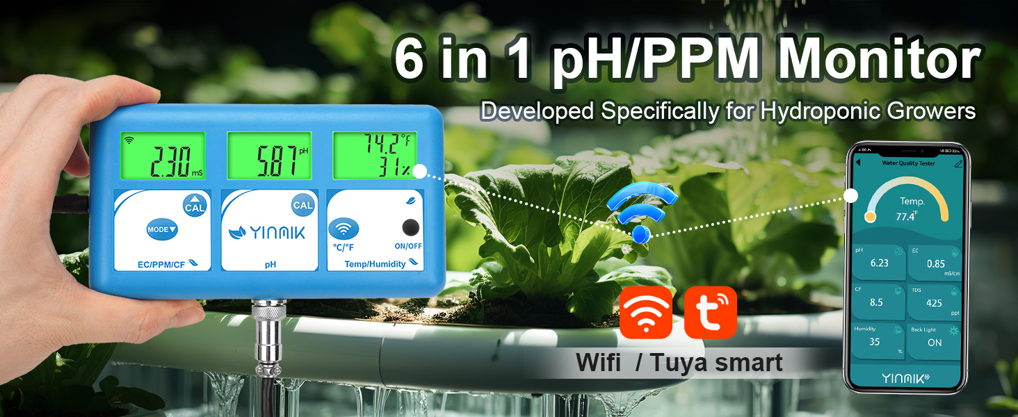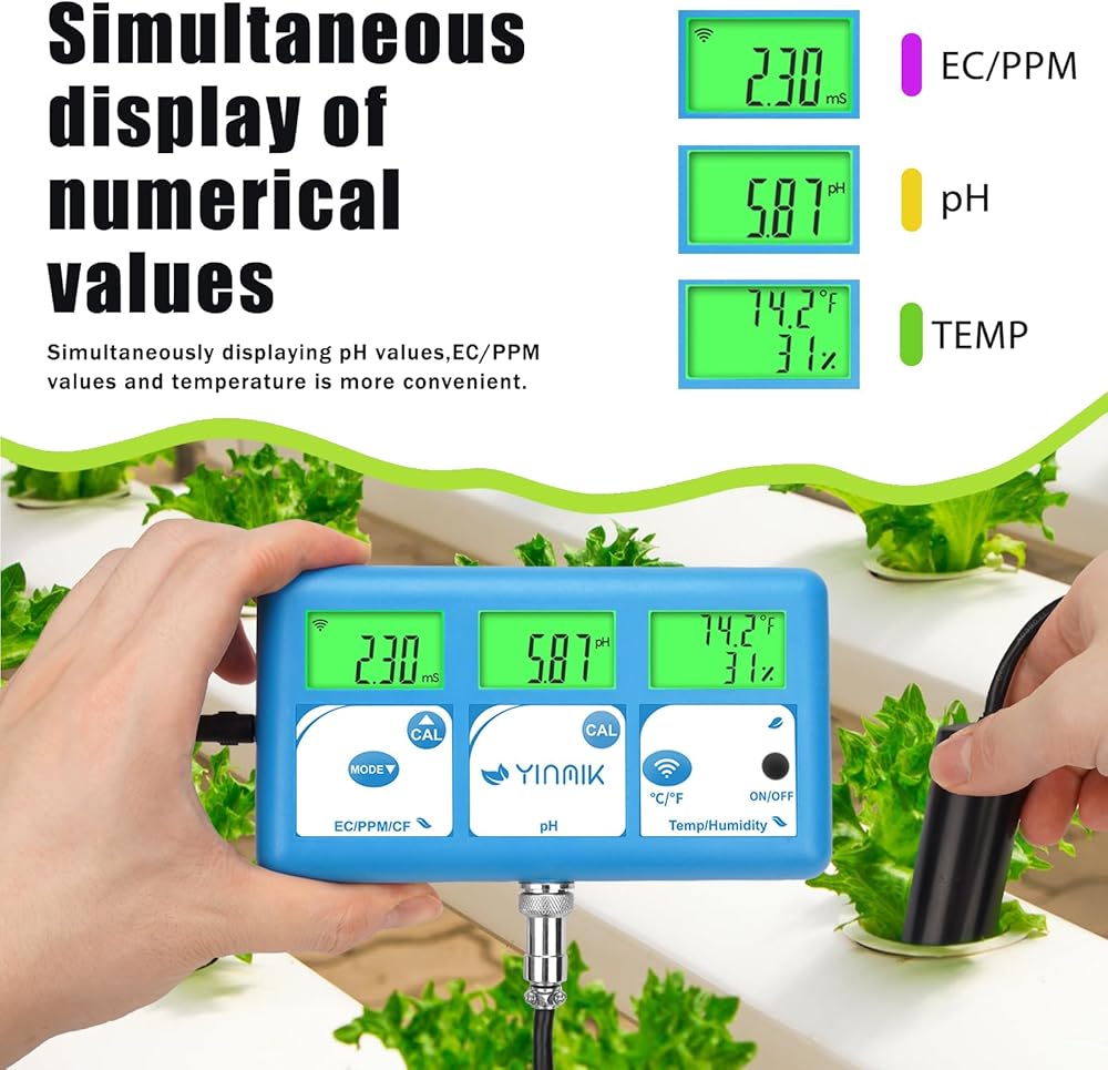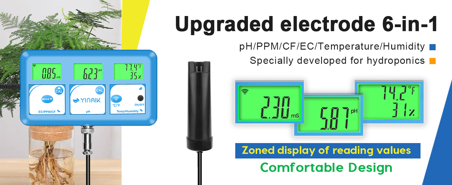 ✅[ 5 in 1 pH EC PPM TEMP Humidity Monitor for hydroponic plants] YINMIK 5-in-1 hydroponic nutrient monitor can give you consistent accurate pH, TDS, Electrical Conductivity , Temperature , Air Humidity testing. YK-6SP pH ppm Tester probe is new upgraded composite probe , one probe can measure all parameters of pH, TDS, EC and TEMP at the same time, fully meet the needs of hydroponics nutrients water monitoring.